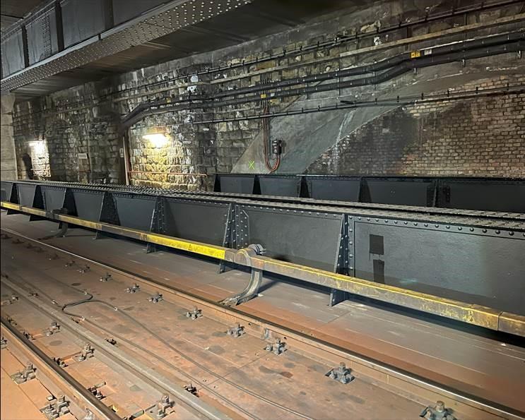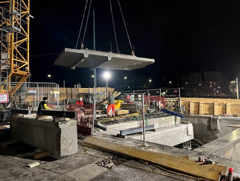 Alte Brücke zerschneiden, abtransportieren: Wir zerschneiden die bestehende Stahl-Brücke in kleine Teile. Die Einzelteile heben wir mit einem Kran durch die Transportöffnung aus dem Gleisgeschoß.
