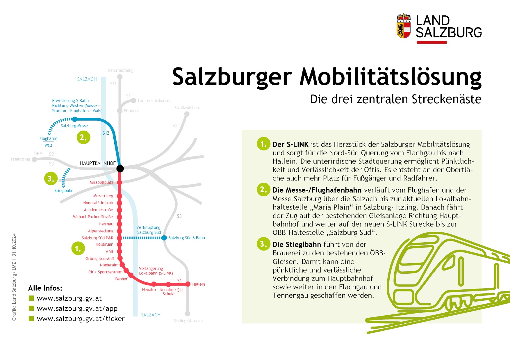 Der S-Link, also die unterirdische Verlängerung der S-Bahn bis Salzburg Süd und oberirdisch weiter bis nach Hallein bleibt bei der Salzburger Mobilitätslösung das Herzstück. Ohne ihn wären alle weiteren Streckenäste im Sinne der angestrebten Verkehrsentlastung nicht möglich. Er sorgt für die Nord-Süd Querung und ermöglicht durch seine Unabhängigkeit vom Verkehr in der Stadt über ihm die Pünktlichkeit und Verlässlichkeit der Öffis. Zudem entsteht an der Oberfläche auch mehr Platz für Fußgänger und Radfahrer.
