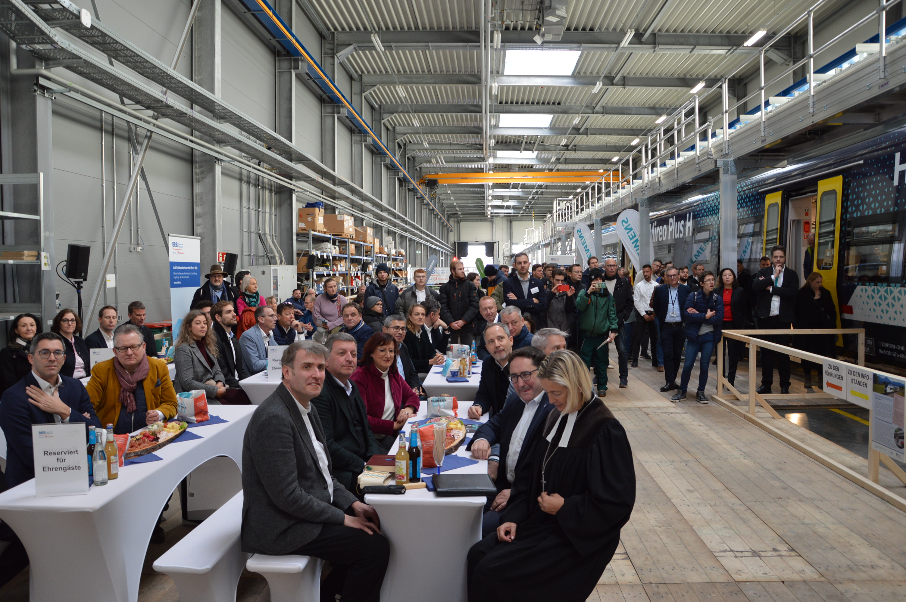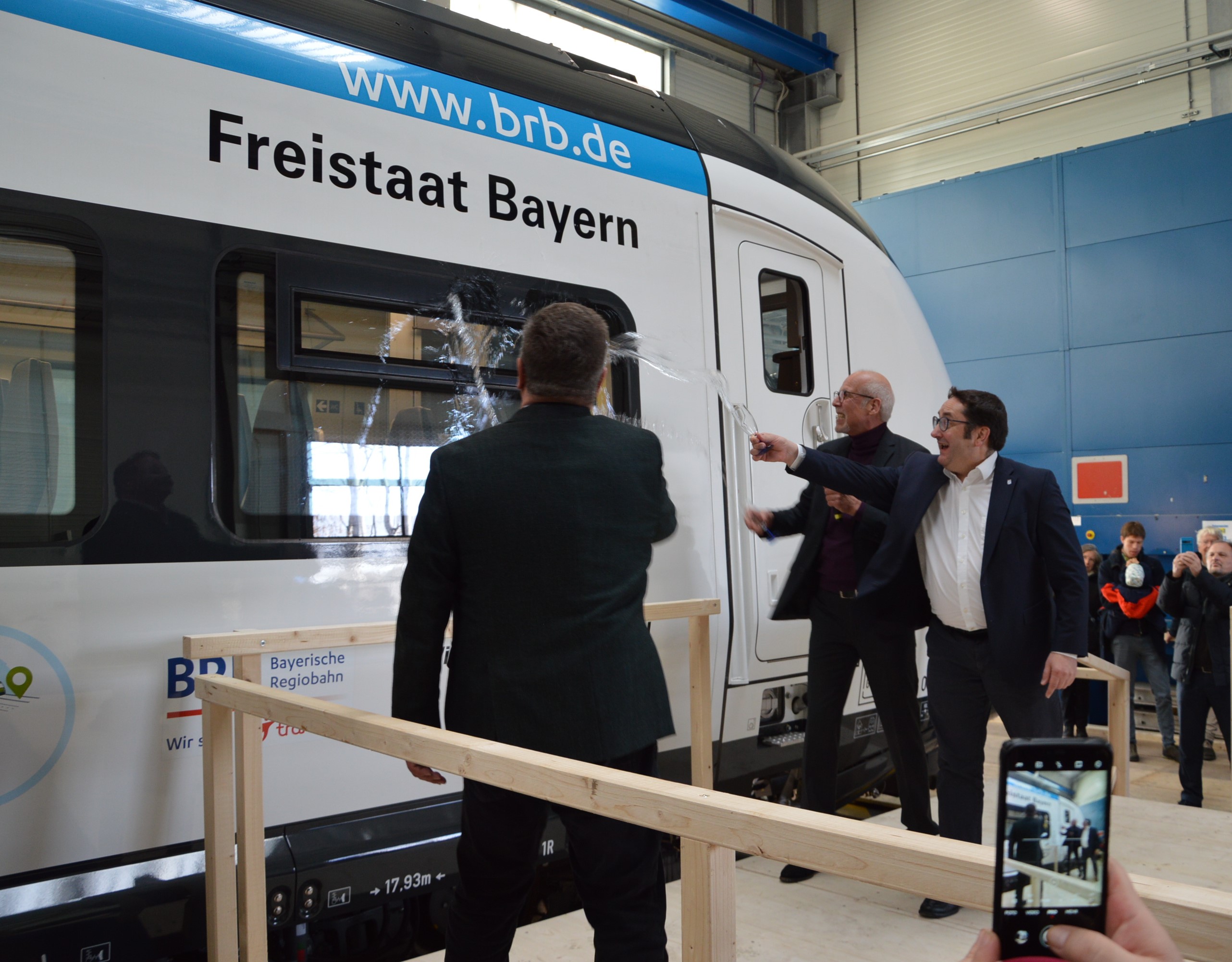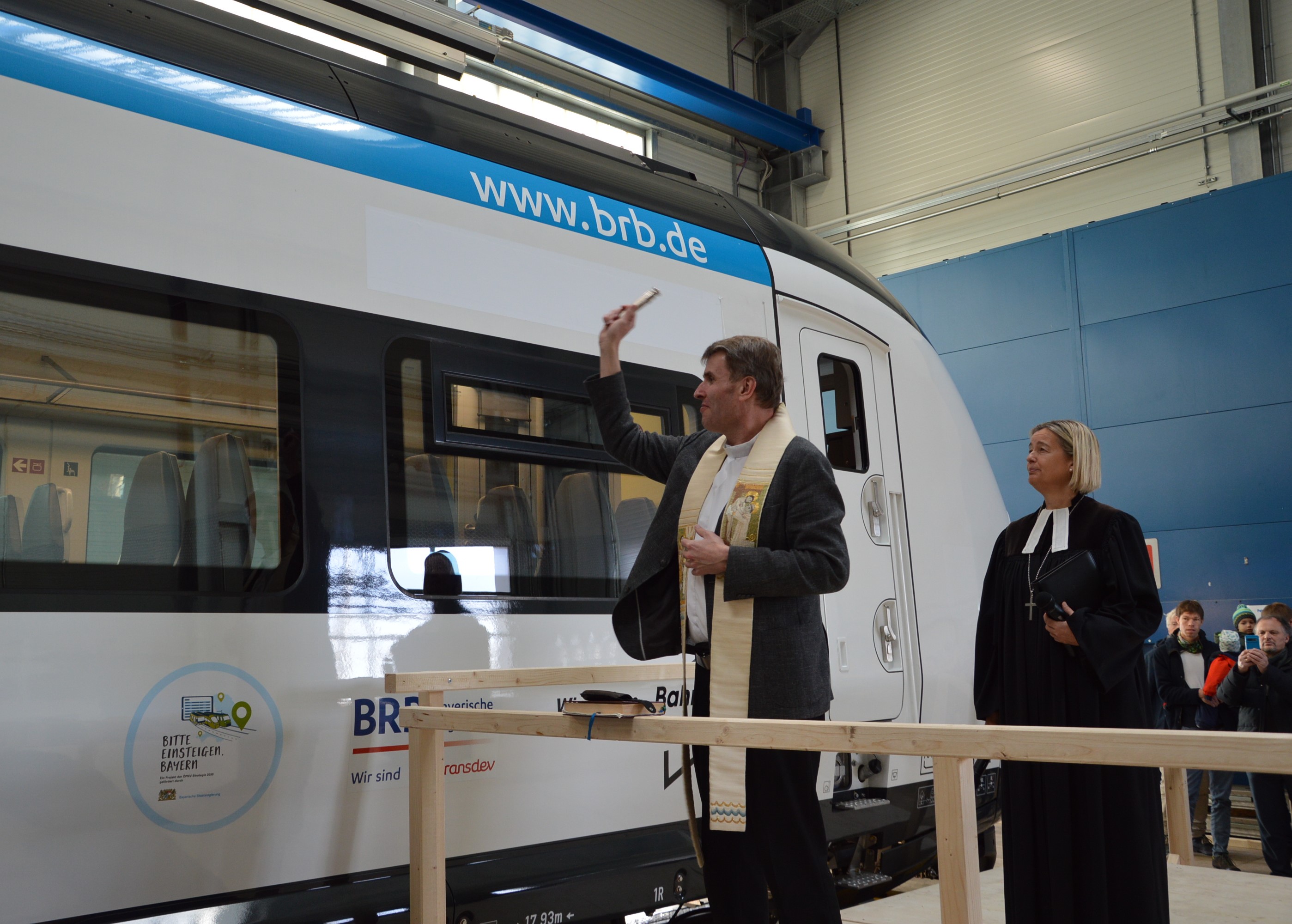 Einen Blick in das Fahrzeuginnere warf auch Pfarrer Bernd Udo Rochna, der zusammen mit Dekanin Dr. Doris Sperber-Hartmann den Zug segnete. Er war früher selbst Triebfahrzeugführer bei der S-Bahn München. Beide hatten bereits einen Zug der BRB gesegnet, Rochna den 1.000sten LINT, der den Namen „Augsburg“ trägt, Sperber-Hartmann einen LINT mit dem Namen „Schmiechen“. Der Wasserstoffzug führt nun den Namen „Freistaat Bayern“, was die Verbundenheit der Projektpartner hervorhebt. Getauft wurde der Zug mit Flusswasser aus Lech und Wertach.