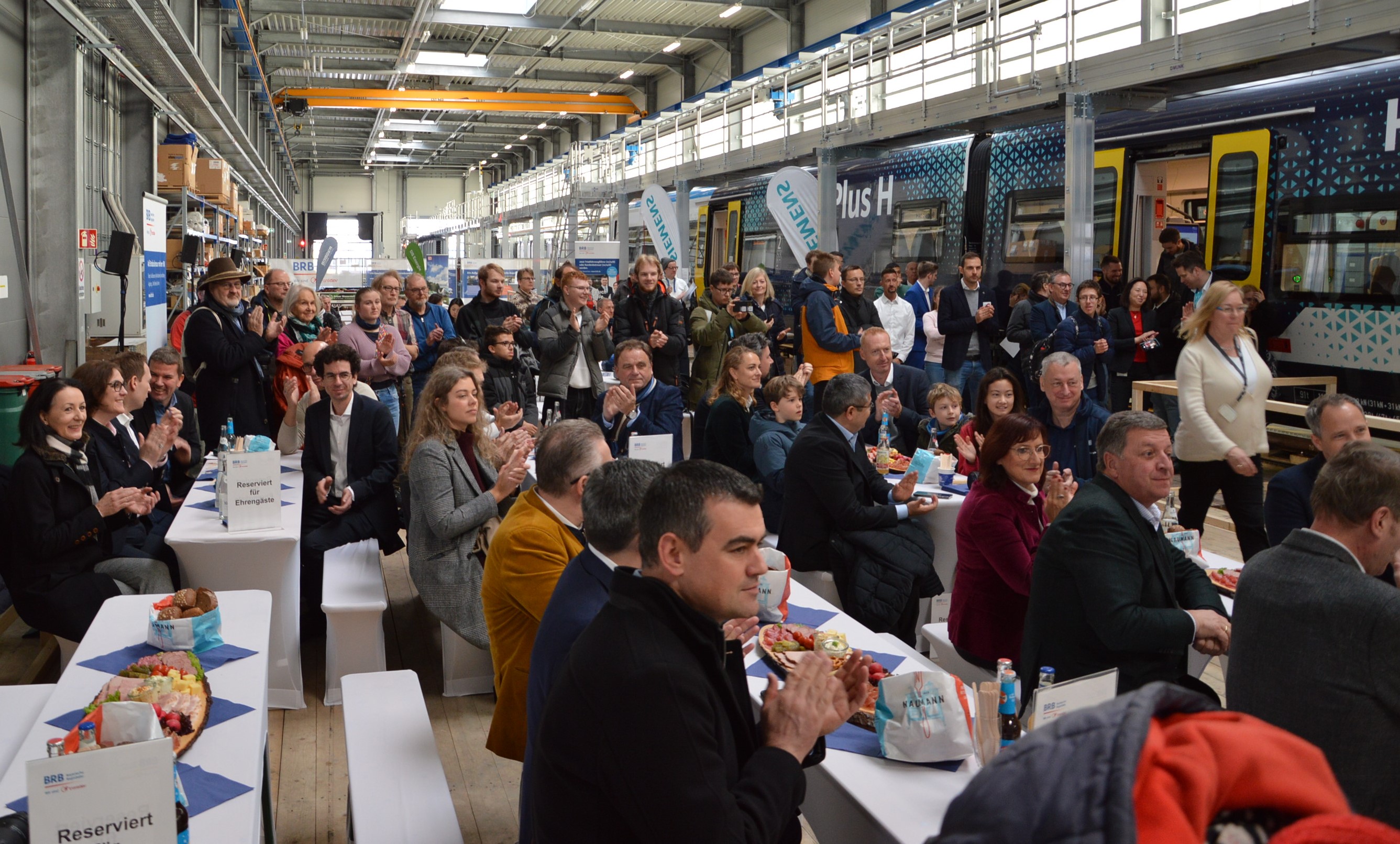 Probesitzen konnten jetzt Interessierte bei der Präsentation des ersten Wasserstoffzuges für Bayern im Bahnbetriebswerk der BRB in Augsburg. Viele zückten ihr Handy und machten Selfies neben dem Zug mit dem klimafreundlichen Antrieb.