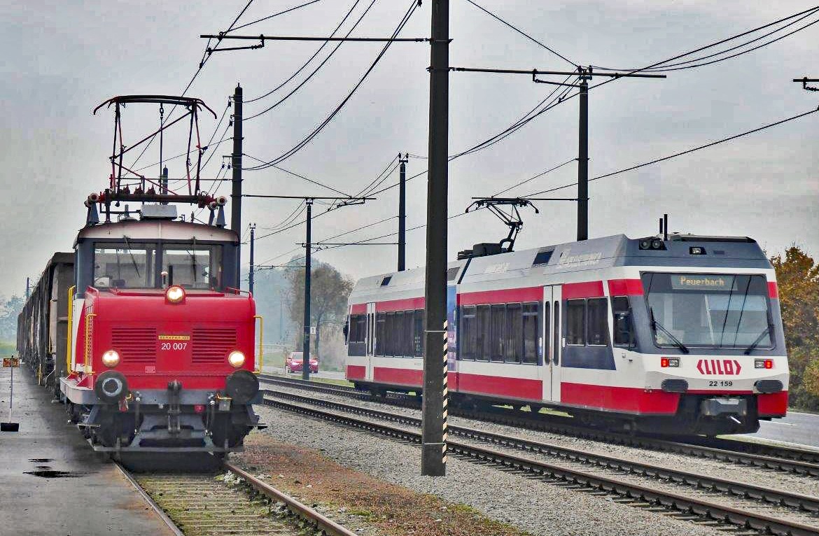 LILO Rübenverkehr: Kreuzung im Rübenbahnhof Emling , links der eben mit E 20.007 (SGP/ELIN,1956) eingetroffene Leerwagenzug am Rübenladegleis und rechts der S-Bahnzug nach Peuerbach mit ET 22.159 (Stadler,2001).