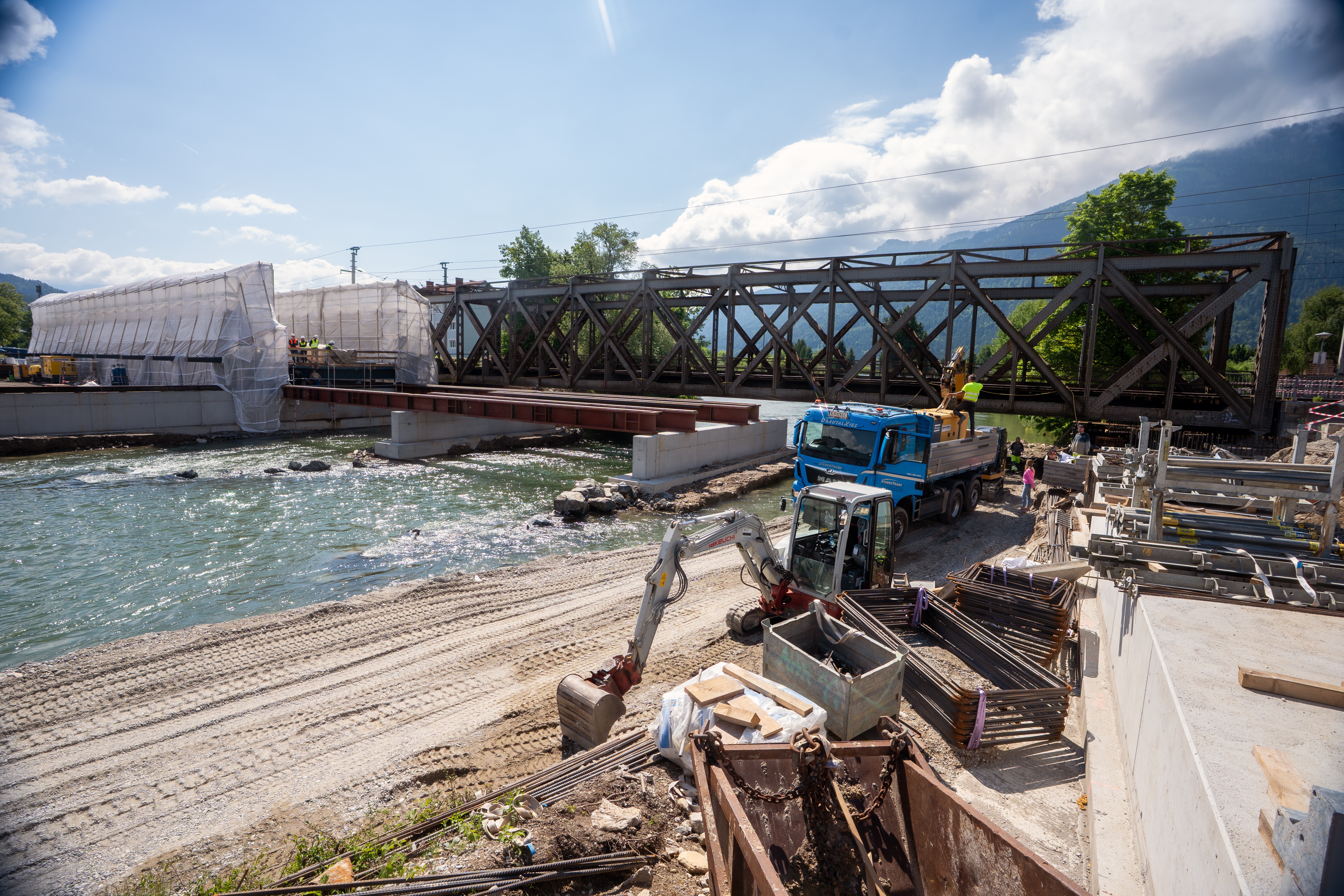 Regionalleiter Franz Jank, ÖBB-Infrastruktur AG, zu den aktuellen Bauarbeiten: „Wir liegen mit den Arbeiten sehr gut im Zeitplan.Nach Sicherungs- und Schüttungsarbeiten wurden die Montagehilfskonstruktion und Verschiebeeinrichtung aufgebaut. Das Brückentragwerk inklusive der Stahlkonstruktionen für Geh- und Radweg wird fix und fertig am Vorplatz montiert, verschweißt und mit Korrosionsschutz versehen. Während der zweiwöchigen Hauptsperre der Brücke muss es dann schnell gehen. Alle elektrotechnischen Anlagen sowie Oberbau- und Kabelanlagen werden abgetragen, das alte Tragwerk aus- und das Neue eingeschoben und anschließend werden die eisenbahnspezifischen Anlagen wieder hergestellt. Die Hauptarbeiten werden mit einer Belastungsprobe abgeschlossen. Anschließend erfolgt die Verkehrsfreigabe für den Bahnverkehr mit 14. Juli. Bis zur Freigabe des Geh- und Radweges wird aber noch einiges zu tun sein. Wir sind zuversichtlich die Eröffnung des Radweges bis 1. November umsetzen zu können.“