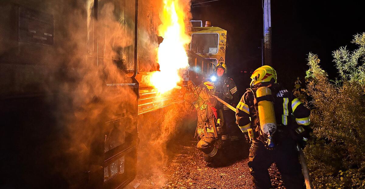 Brand eines Bauzuges: Bahndienstfahrzeug auf Pyhrnbahnstrecke bei Wartberg an der Krems in Flammen | laumat|at