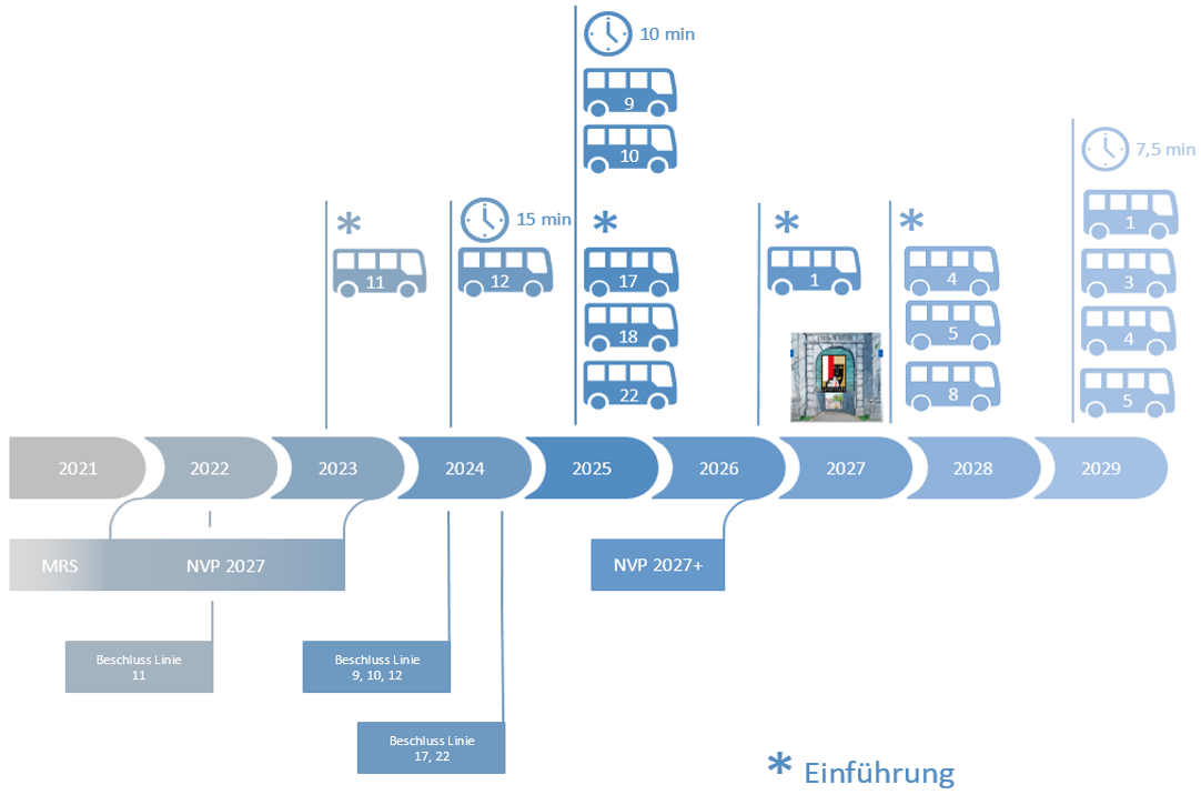 Die Umsetzung des Nahverkehrsplans 2027 schreitet planmäßig voran. Die folgende Grafik zeigt die nächsten Schritte und Meilensteine der Liniennetzreform: