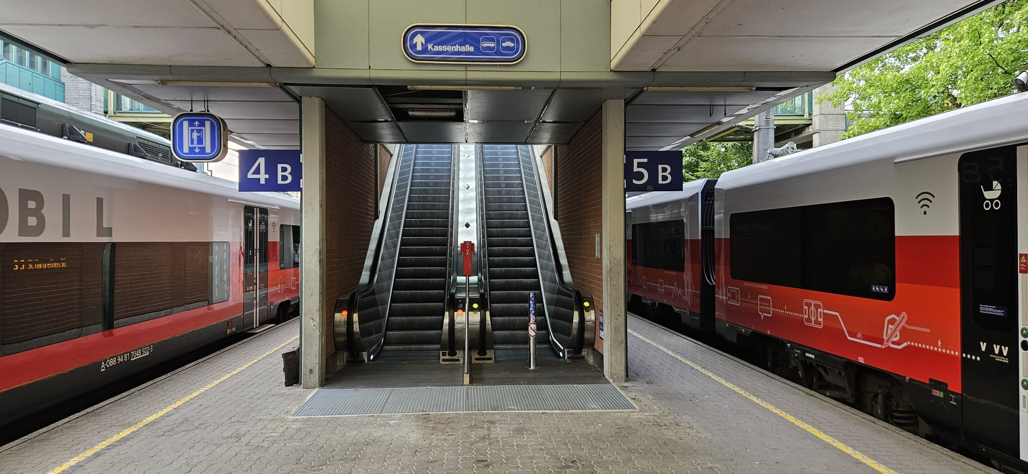 Der Bahnhof Bregenz bietet ab sofort wieder mehr Komfort für Fahrgäste und Besucher:innen. Seit Mittwoch stehen alle sechs neuen Rolltreppen zur Verfügung. Der Höhenunterschied zwischen der Kassenhalle, dem Verbindungssteg und den Bahnsteigen kann nun wieder bequem überwunden werden. Zur Sicherstellung der Barrierefreiheit bleiben die bestehenden Aufzüge weiterhin in Betrieb.