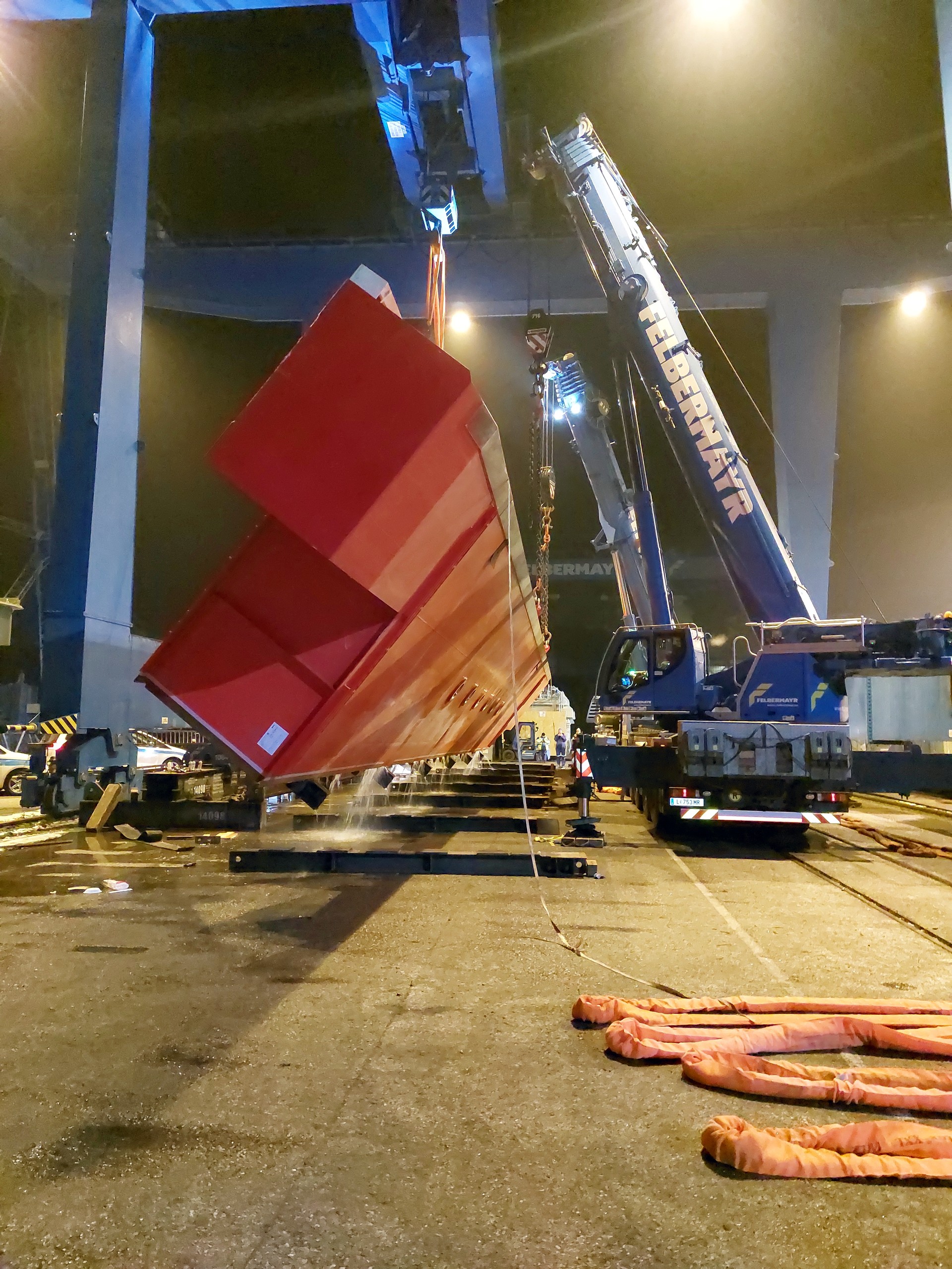 Das Aufdrehen der beiden Teile erfolgte beim Felbermayr Schwergutterminal im Schwerlasthafen Linz.