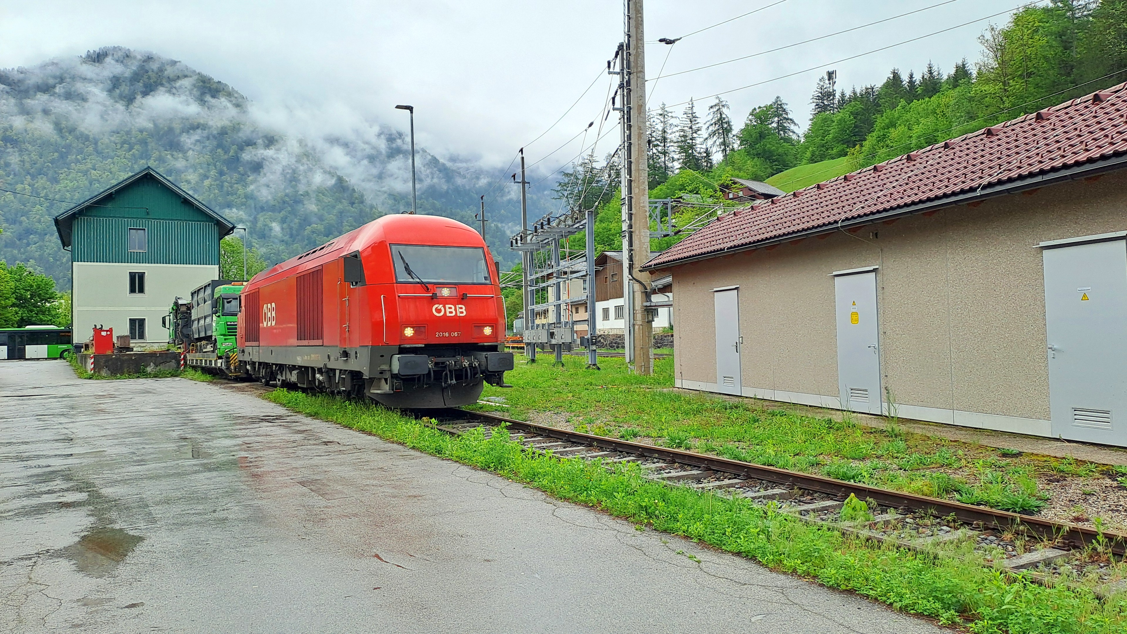 Arbeitszug bestehend aus ÖBB 2016, 2 Auffahrwagen beladen mit 2 Spezial-LKW