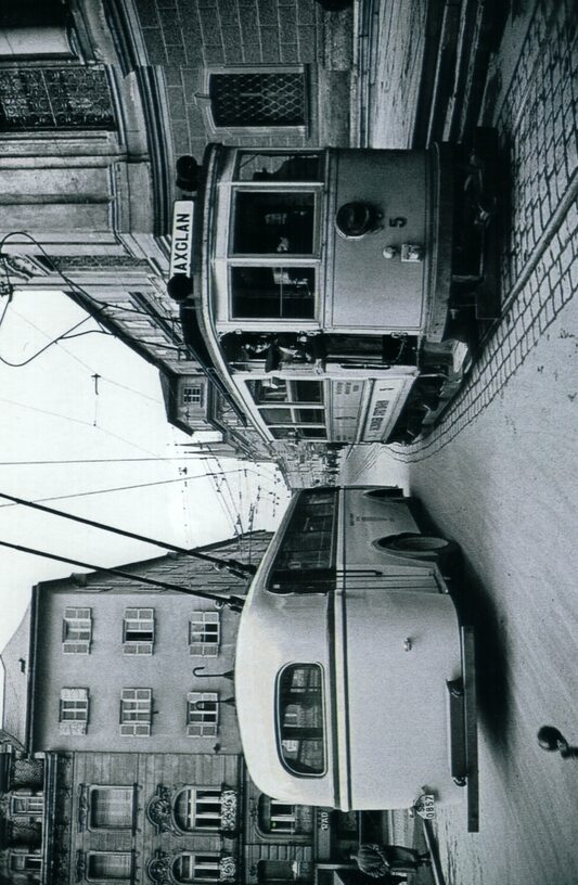 Only between 1. Oktober 1940 and 5. November 1940 trolleybuses and trams met in Salzburg – then the tram system closed and trolleybuses took over the service. Obus 103 (MAN/Schumann/BBC/1940) meets tram 5 (MAN/ÖSSW/1909) on Makartplatz.