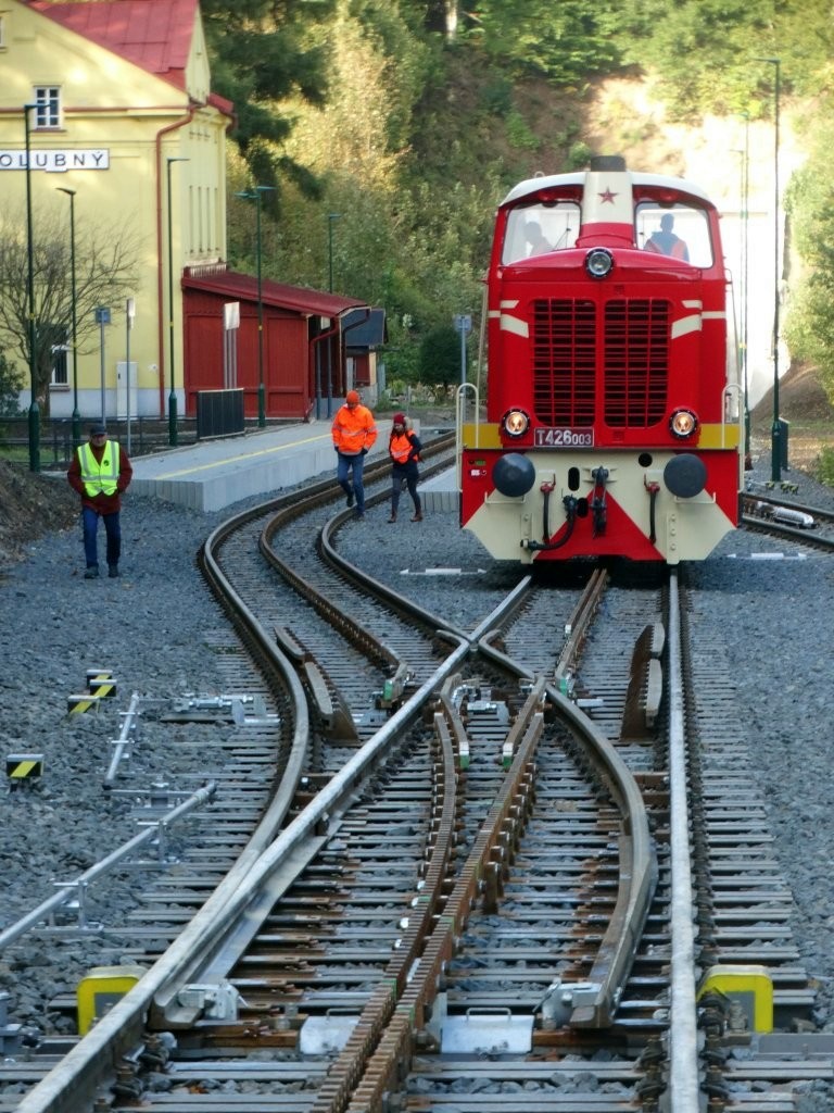 „Am 2. Oktober fand auf der Strecke Tanvald–Kořenov eine weitere Probefahrt mit der Lokomotive der Reihe 715 (in den 1960er-Jahren von SGP in Österreich hergestellt und auf der Erzbergbahn getestet) statt. Ziel war die Überprüfung der Funktionalität von drei speziellen Zahnstangenweichen mit einem Abt-Zahnstangensystem, die wir entworfen, gefertigt und geliefert haben.