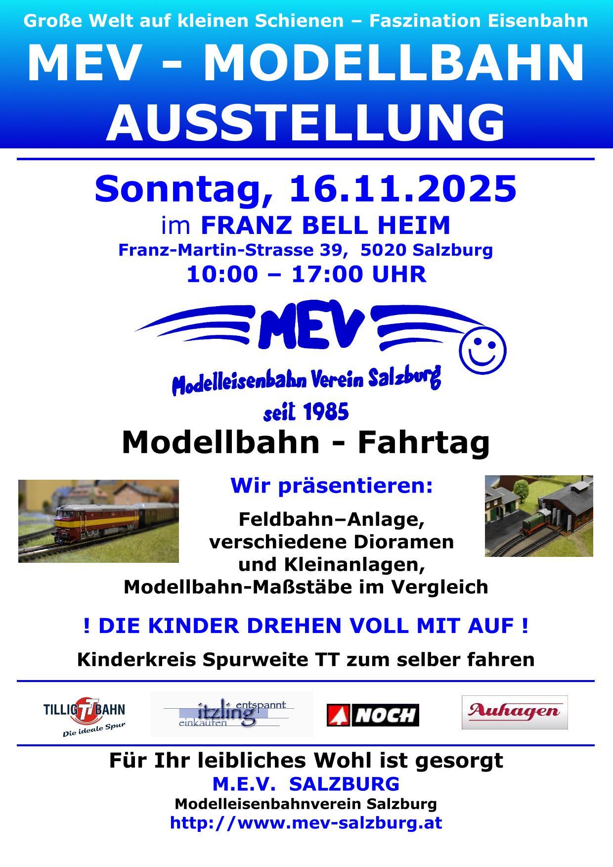 Der MEV-Salzburg lädt am 16. November von 10 – 17 Uhr ins Franz-Bell-Heim in Lehen zum Modellbahn-Fahrtag ein. Zahlreiche Anlagen und Dioramen warten auf große und kleine Besucher – Eintritt frei, Spenden willkommen!