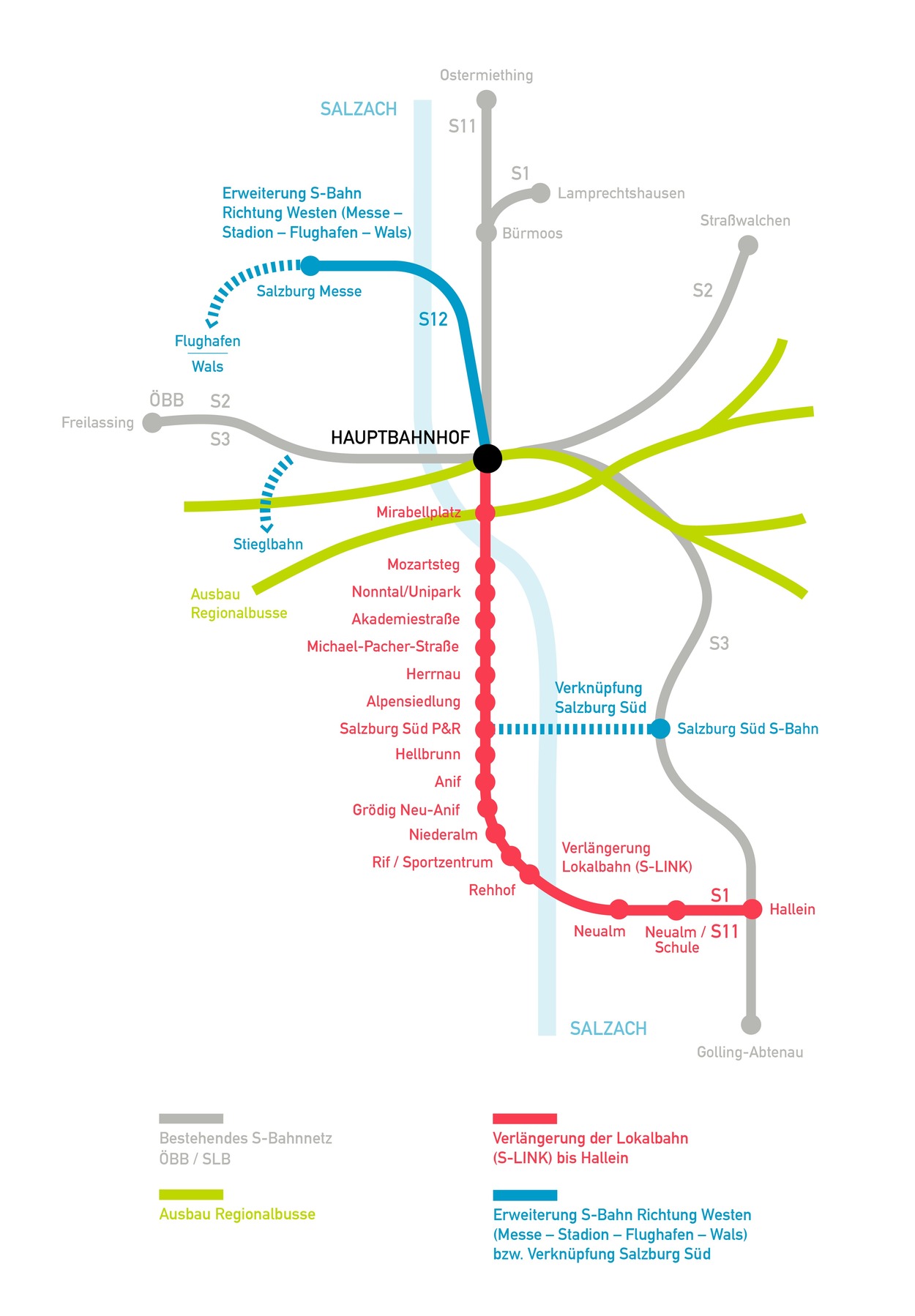 Erst durch den S-LINK würde eine Messebahn - Flughafenbahn, eine Königsseebahn, eine Ischlerbahn und eine Trumer-Seen-Bahn Sinn machen. Denn alle weiteren Lösungen eint ein Problem. Ohne S-LINK enden diese Lösungen alle an der Stadtgrenze - damit stellt sich eben die Frage: Wie von dort weiter ? Und hier ist nun mal die unterirdische Lokalbahnverlängerung die Lösung, die einzig sinnvolle, weil dann von mehreren Projekten gemeinsam nutzbar, von jeglichen Störungen an der Oberfläche unabhängig und nur eine Schienenlösung verfügt über ausreichend Kapazität die geforderten Umlagerungen von rund 50.000 PKW und weiteres Mobilitätswachstum zu bewältigen !