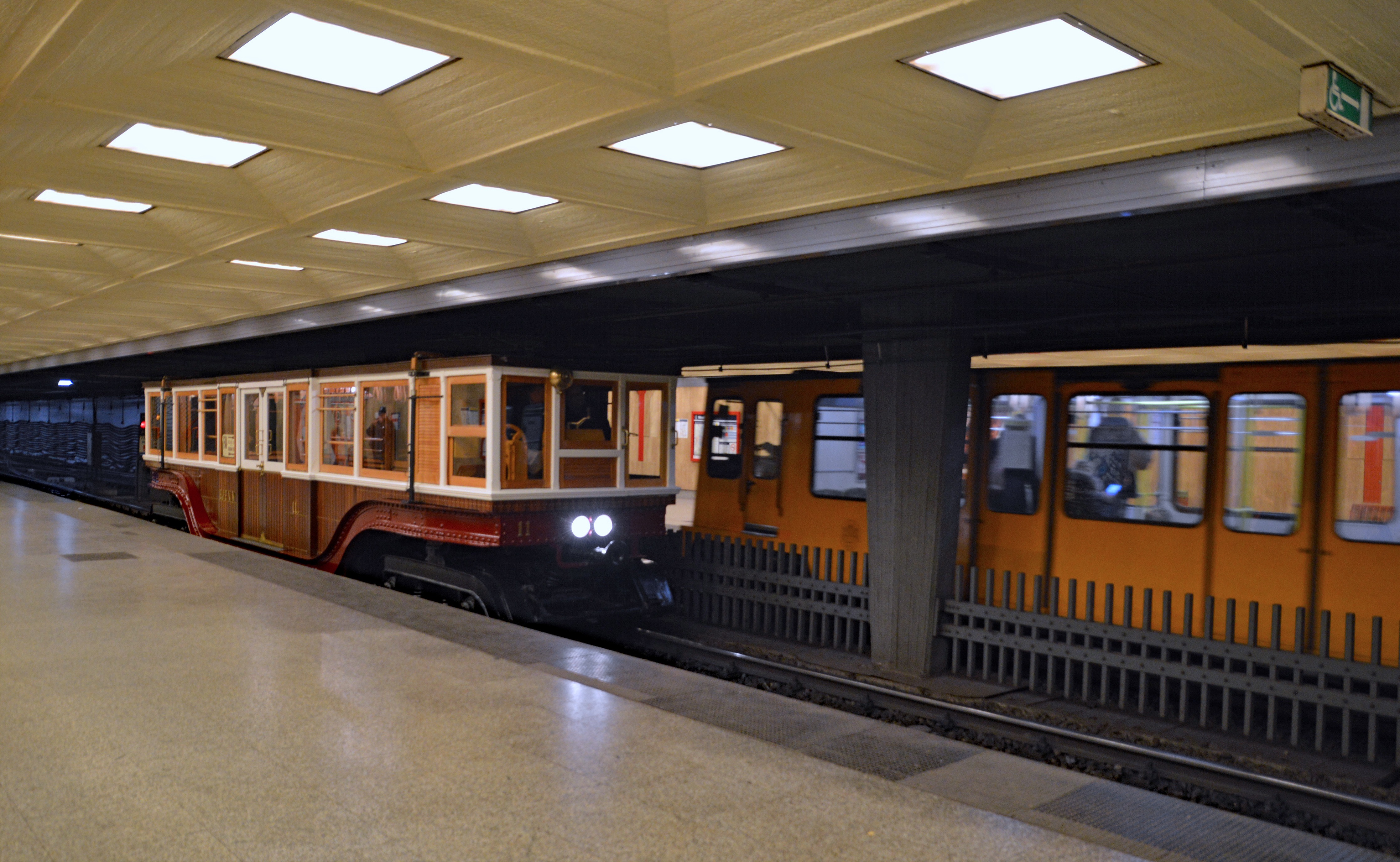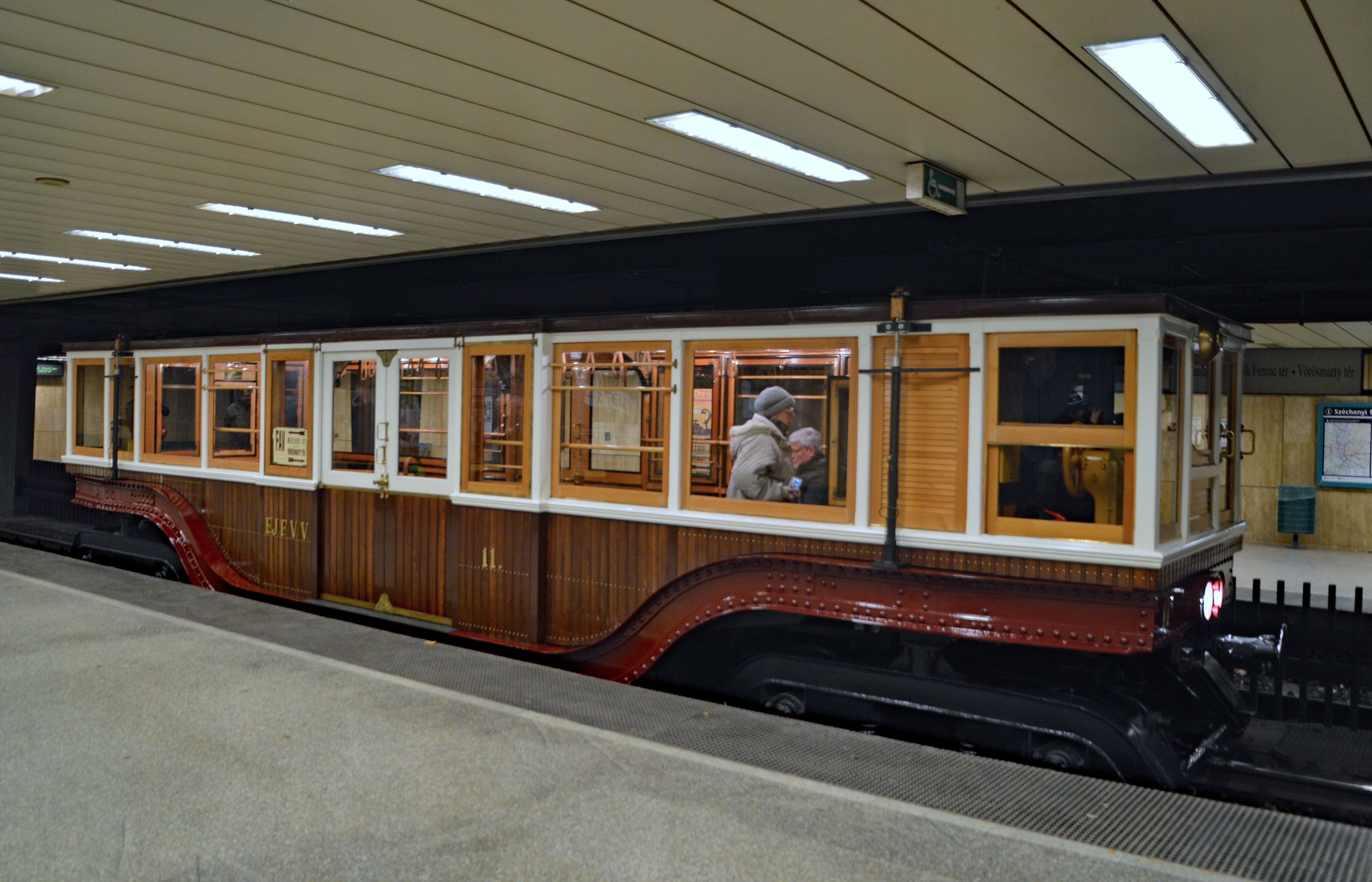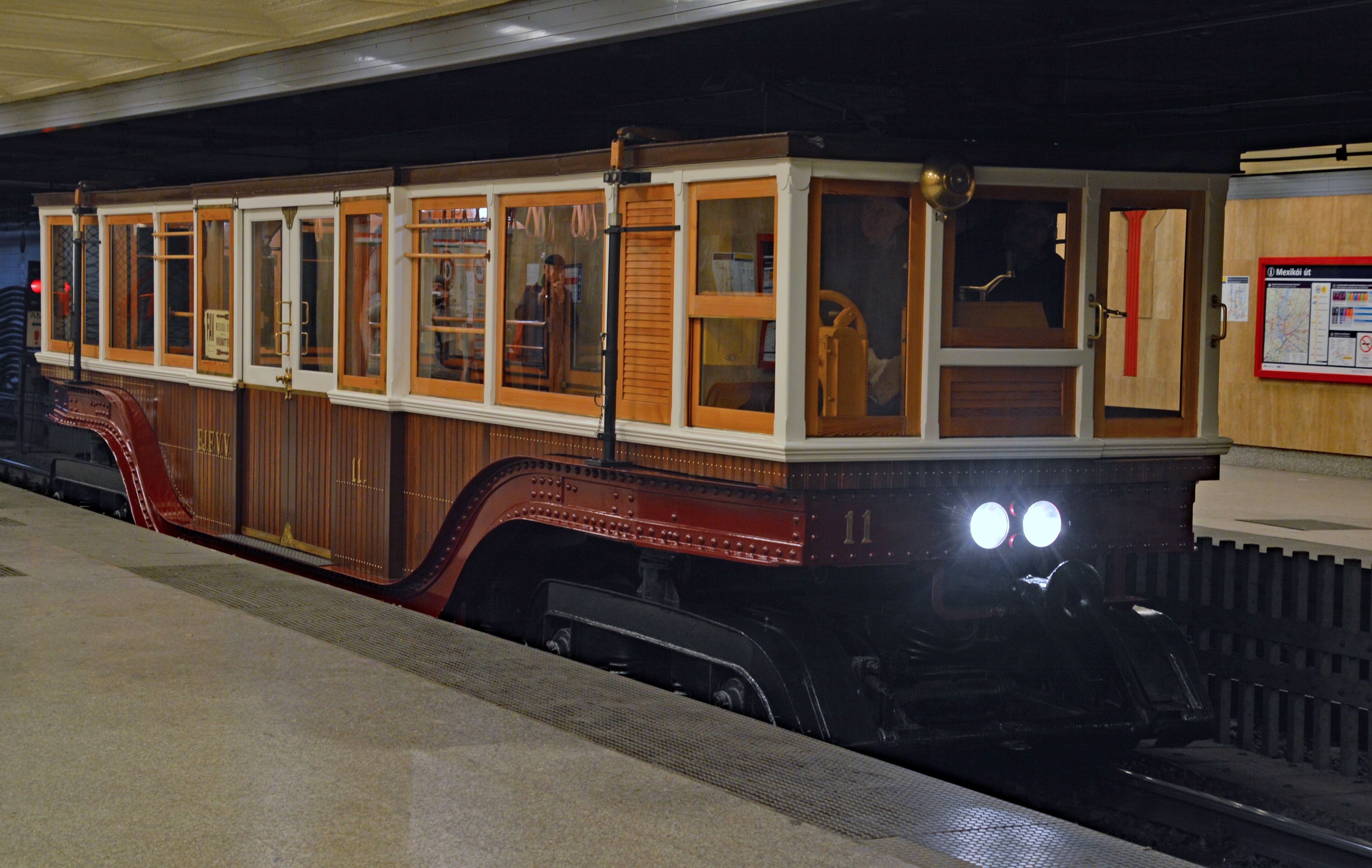 „Földalatti“ – „die Unterirdische“ M1 in Budapest, seit 1896 älteste U-Bahn in Kontinental-Europa unter der Andrássy út, hier mit historischem Triebwagen Nr. 11. Nur Londons „Underground“ ist seit 1863 älter.