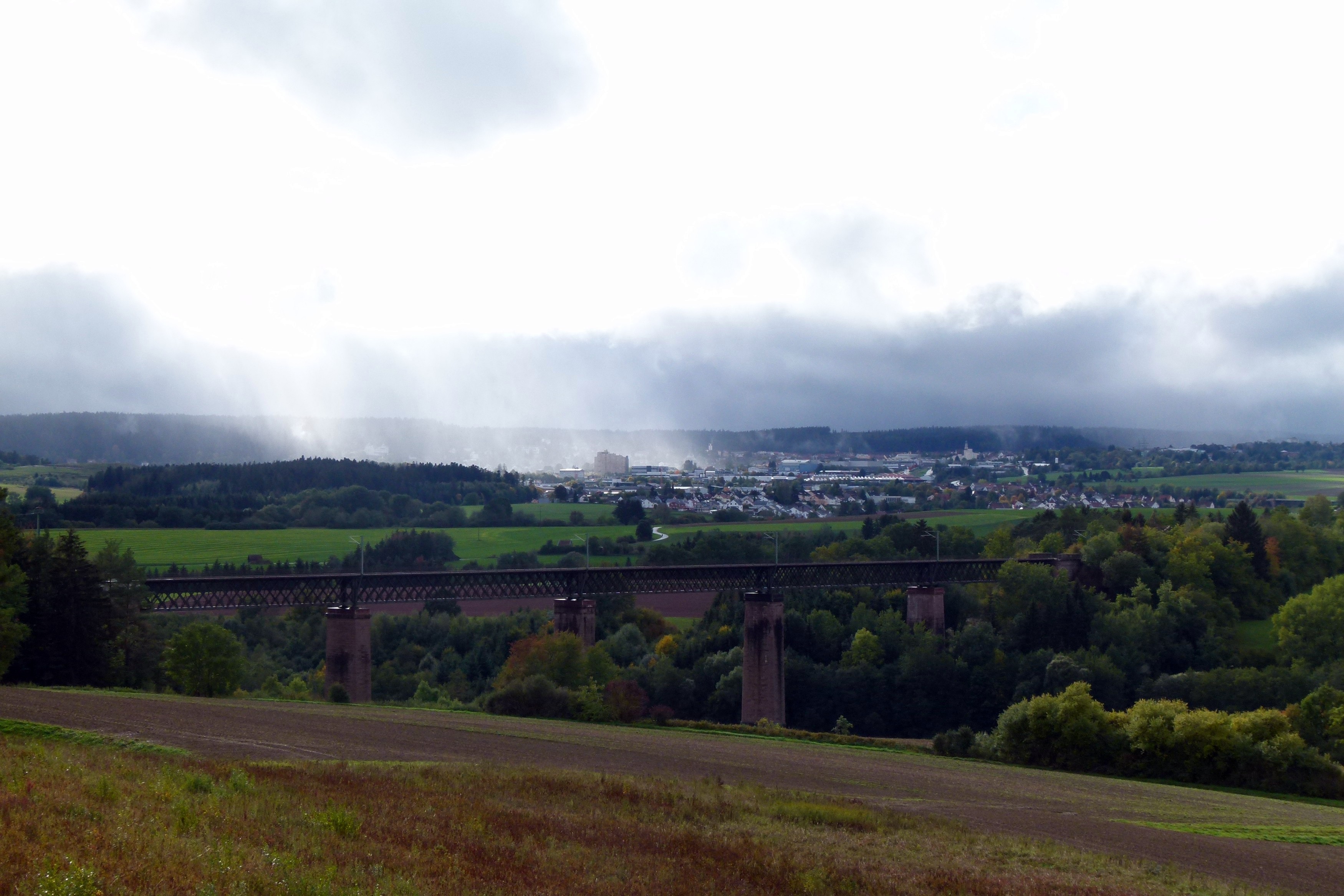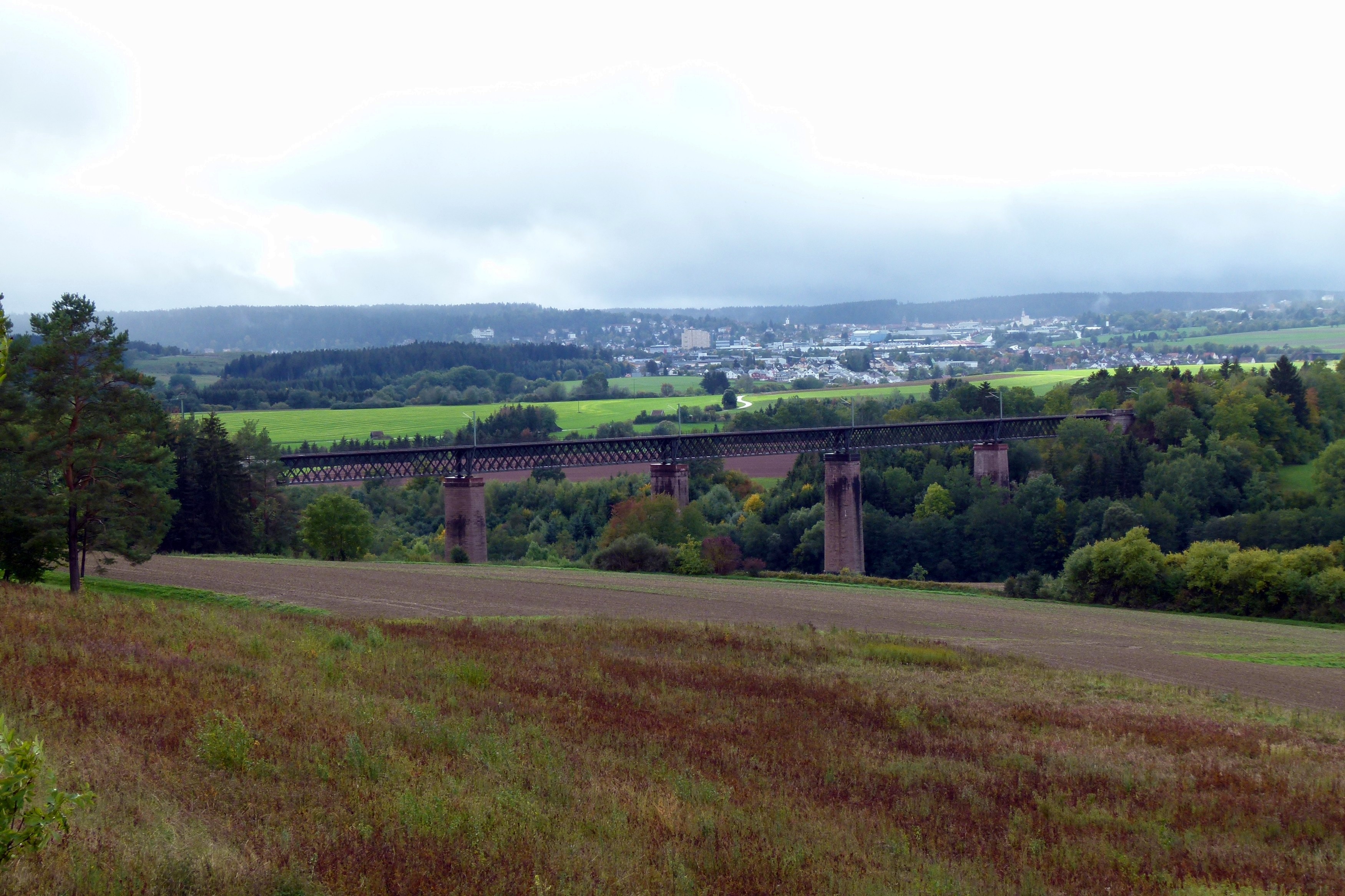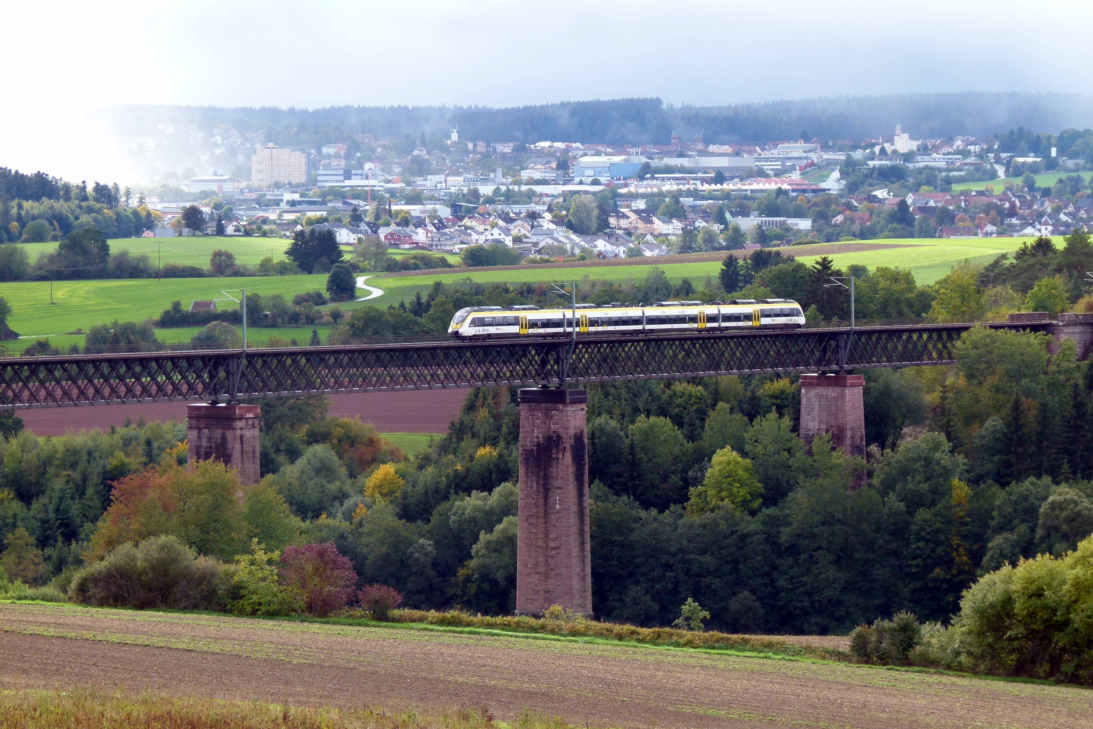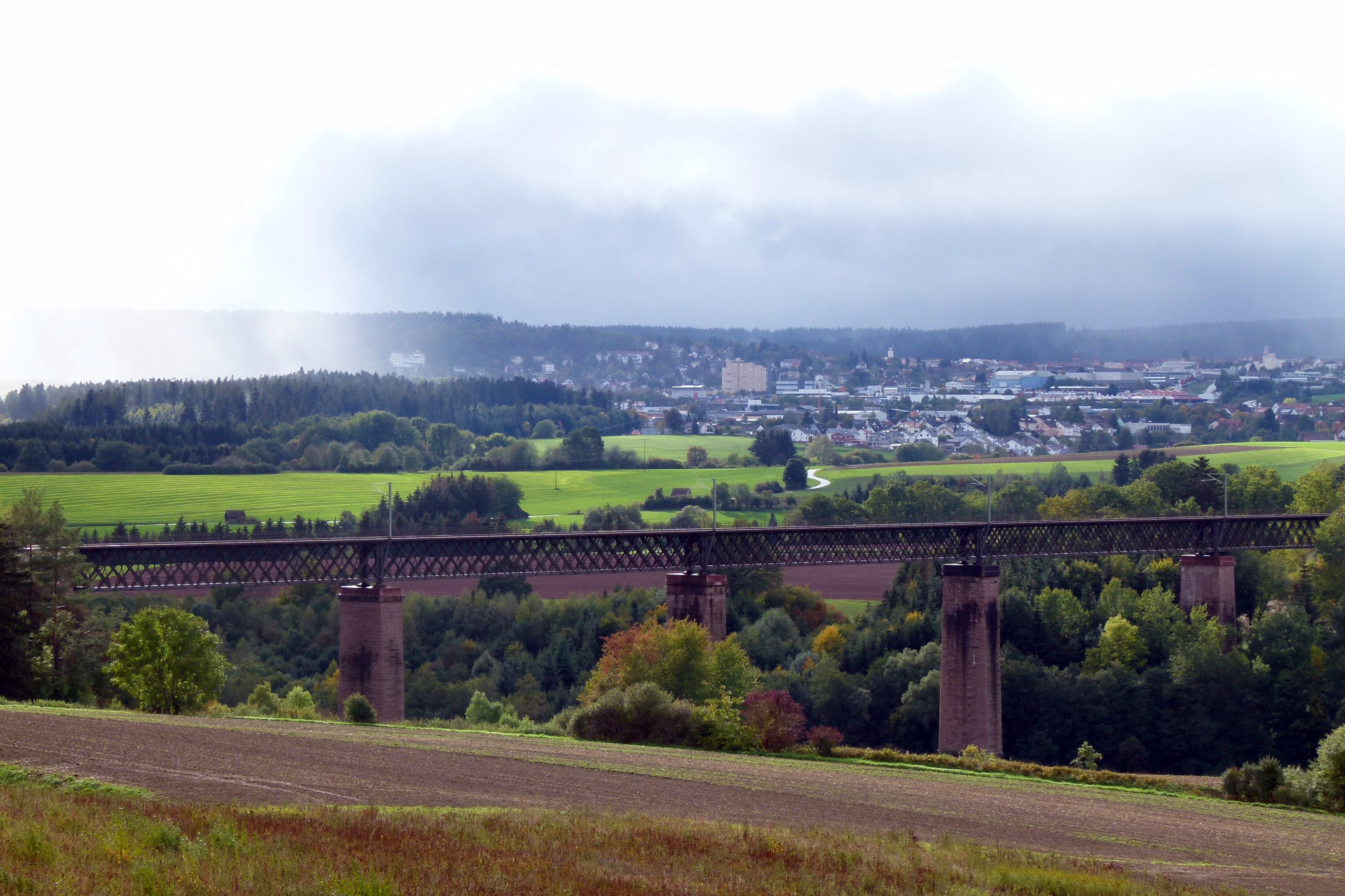 Bahnstrecke Eutingen im Gäu–Schiltach, abschnittsweise auch als Gäubahn beziehungsweise Kinzigtalbahn bezeichnet. Kübelbachviadukt, Baubeginn: 1875, Fertigstellung: 1879, Fachwerkbrücke mit obenliegender Fahrbahn, Höhe: ca. 45 m