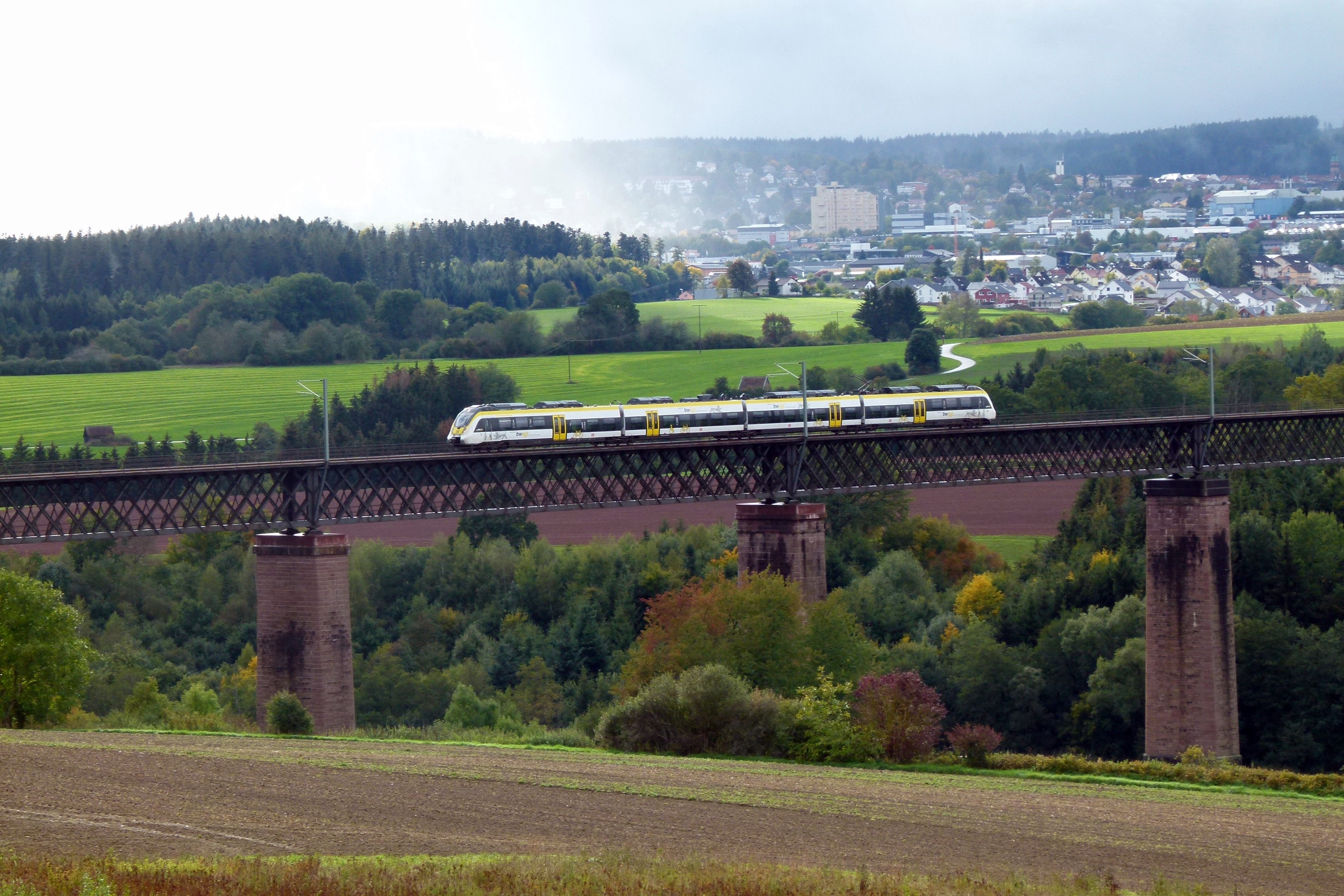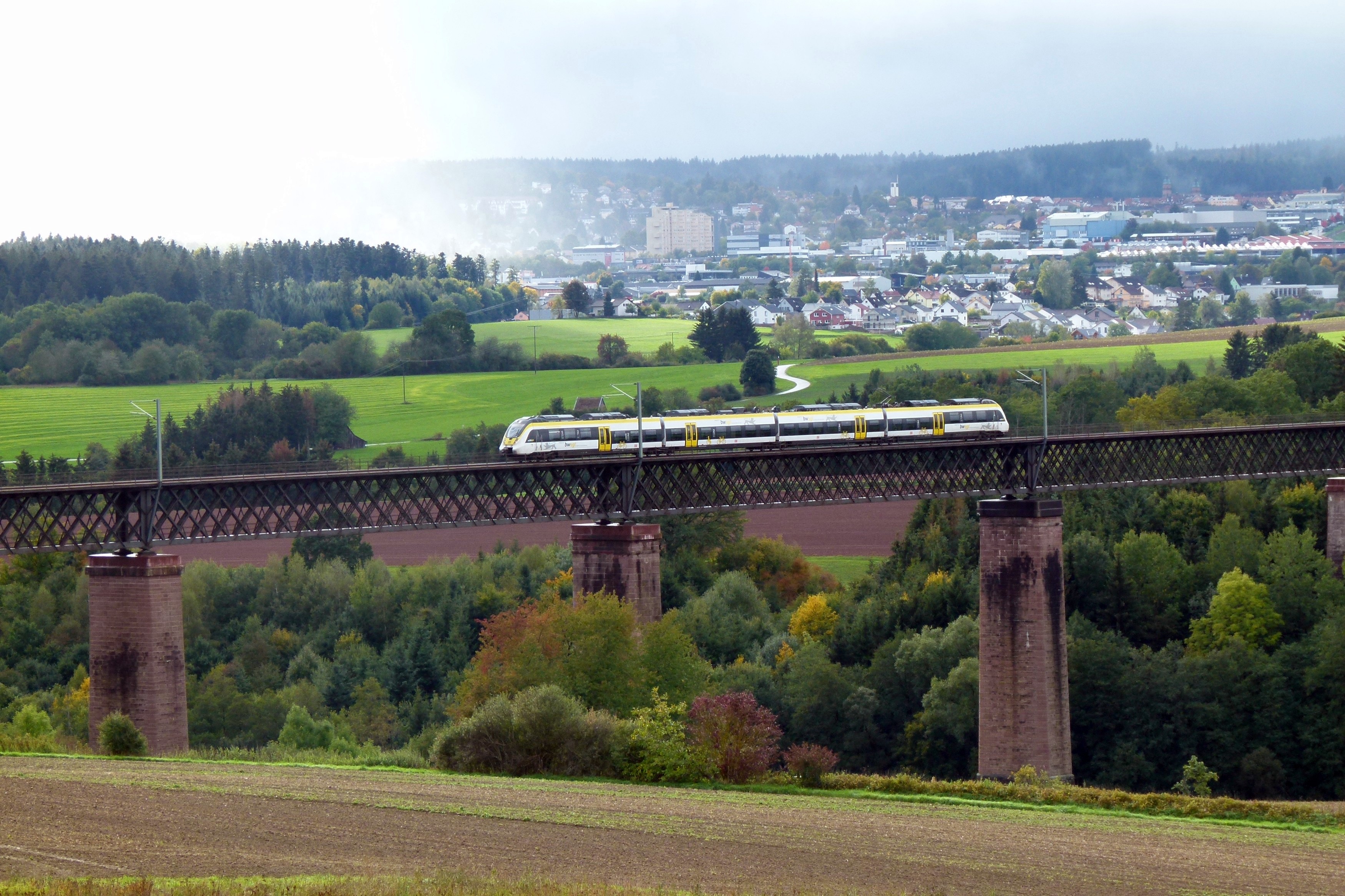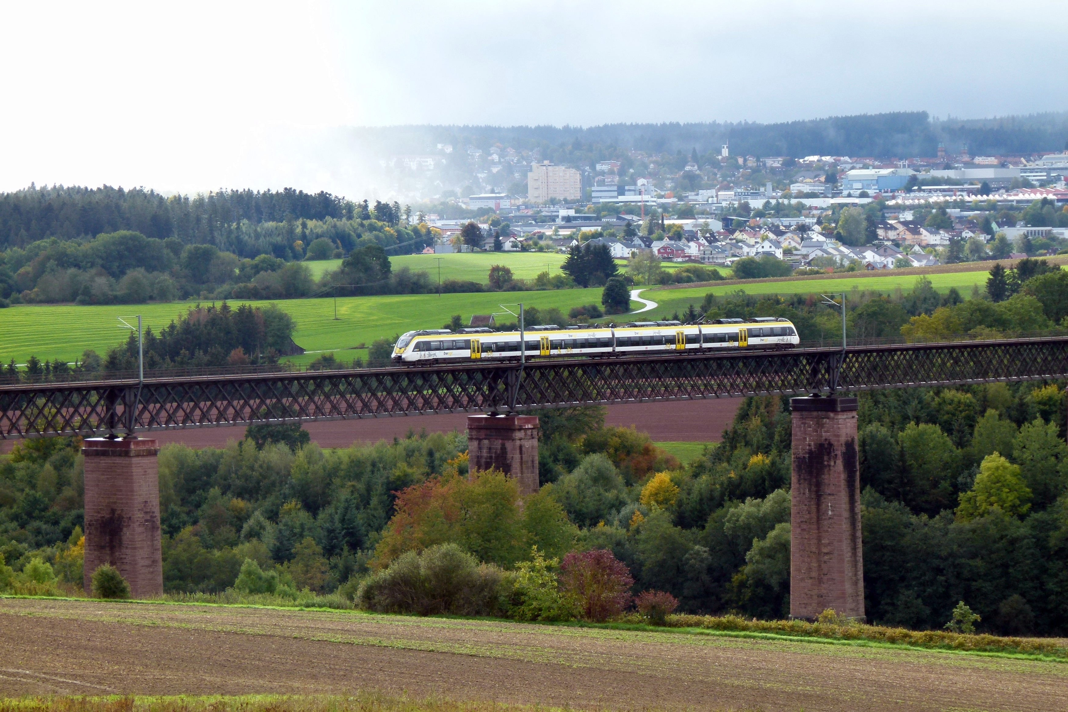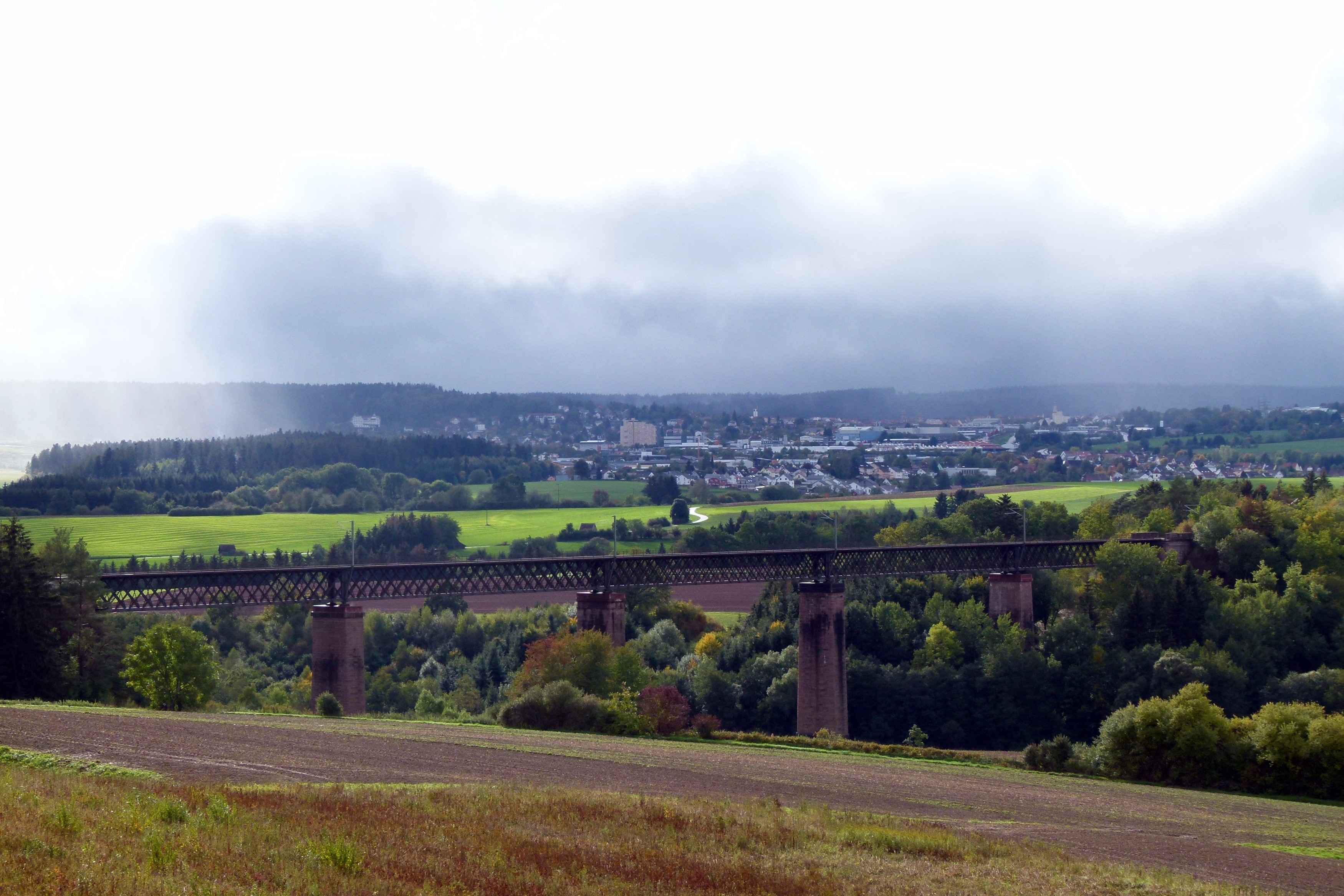 Bahnstrecke Eutingen im Gäu–Schiltach, abschnittsweise auch als Gäubahn beziehungsweise Kinzigtalbahn bezeichnet. Kübelbachviadukt, Baubeginn: 1875, Fertigstellung: 1879, Fachwerkbrücke mit obenliegender Fahrbahn, Höhe: ca. 45 m