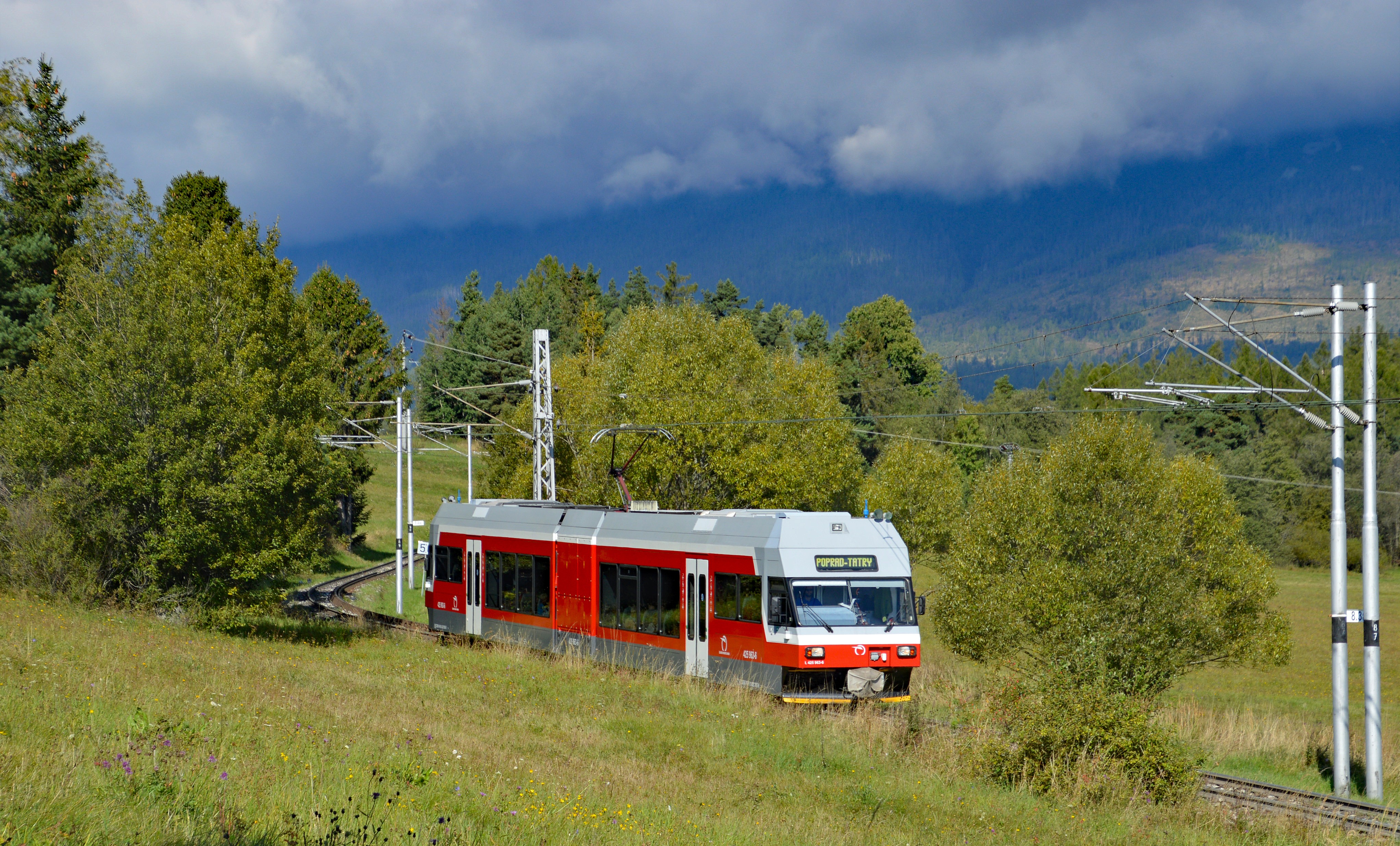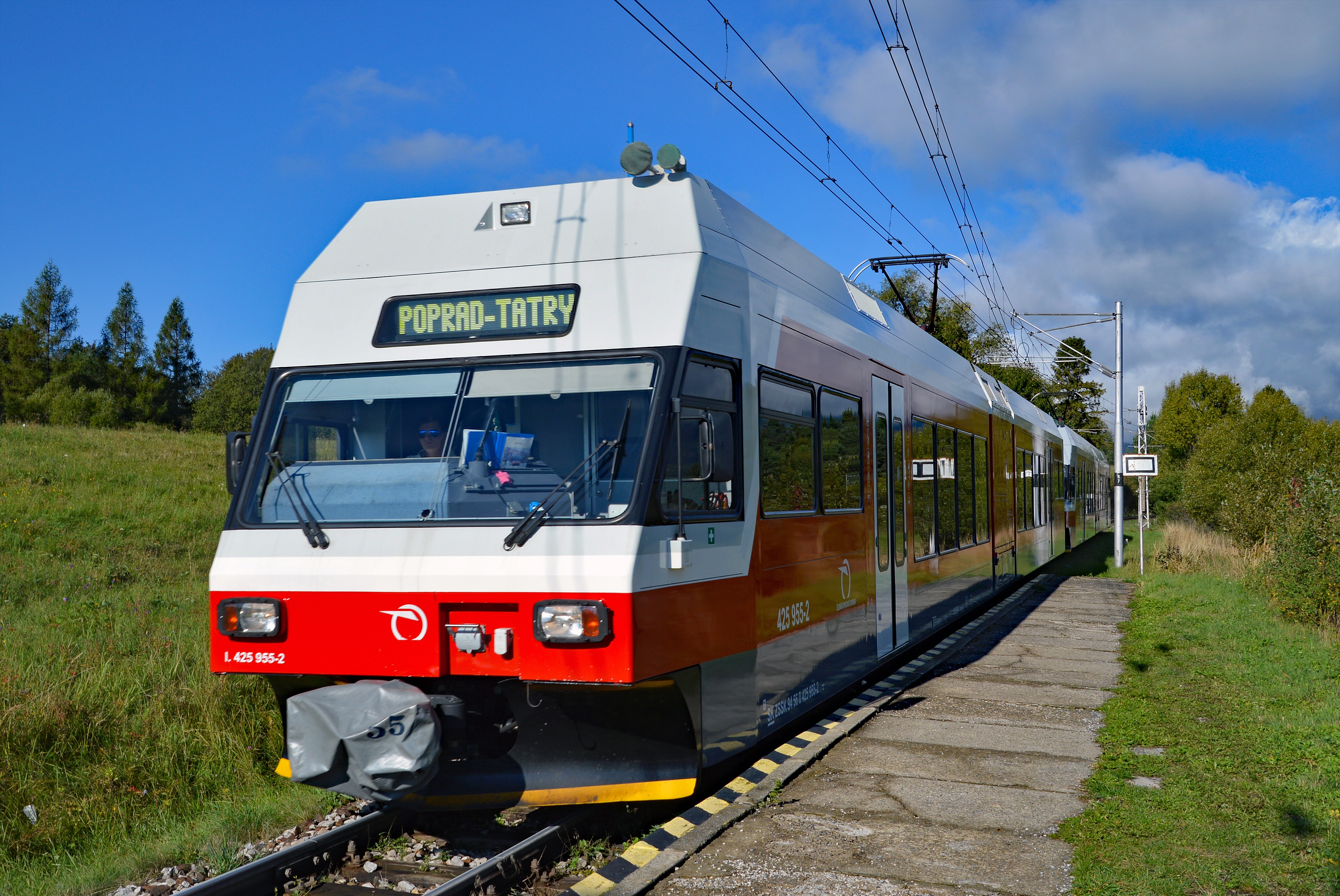 Überstellung Tschirmerbahn-Wagen ins Depot Poprad. Da der Tschirmerbahn-Wagen ein reines Zahnradbahn-Fahrzeug ist, musste bei der Fahrt ins Depot Poprad das Fahrzeug zwischen Stadler-GTW zum Bremsen kuppeln.