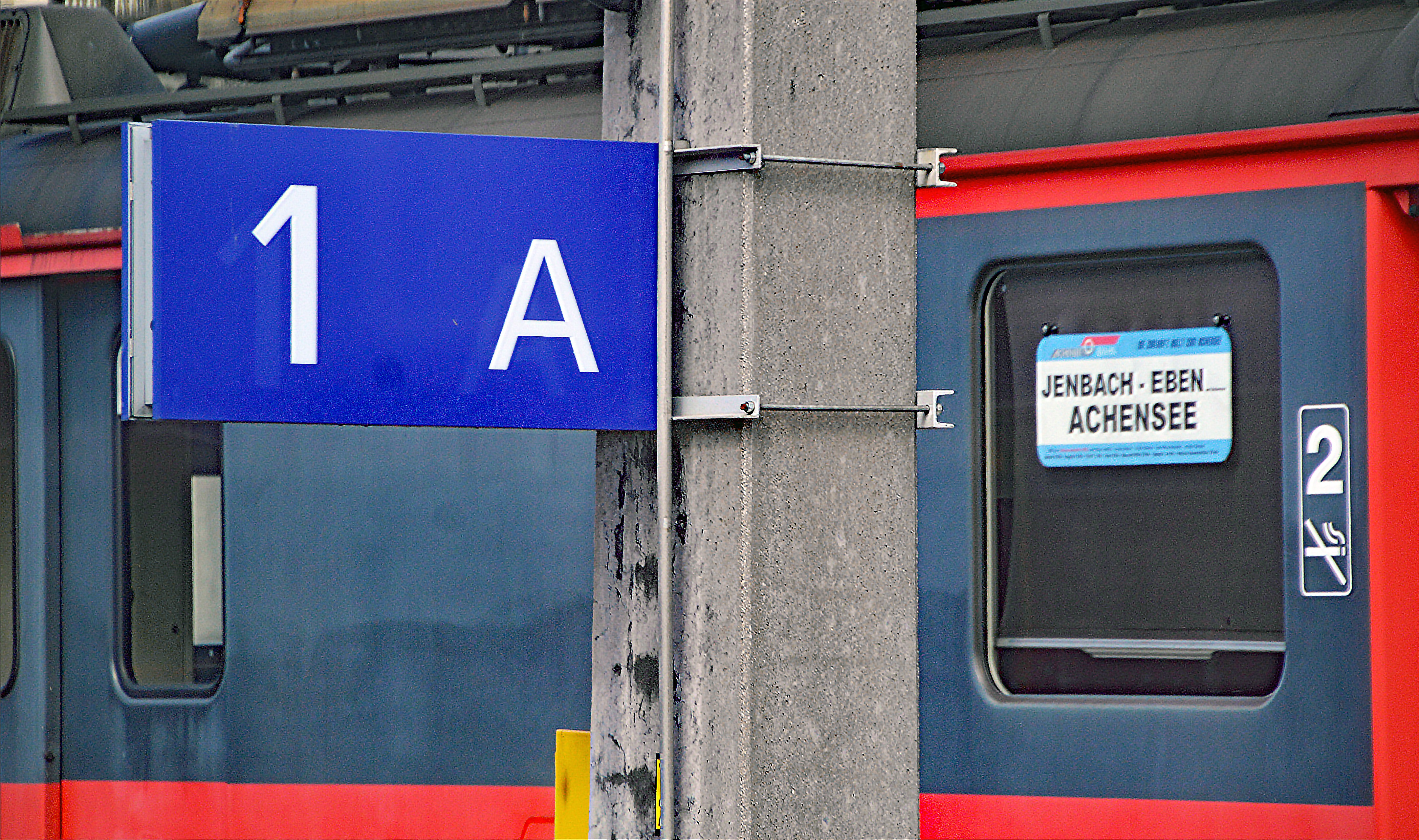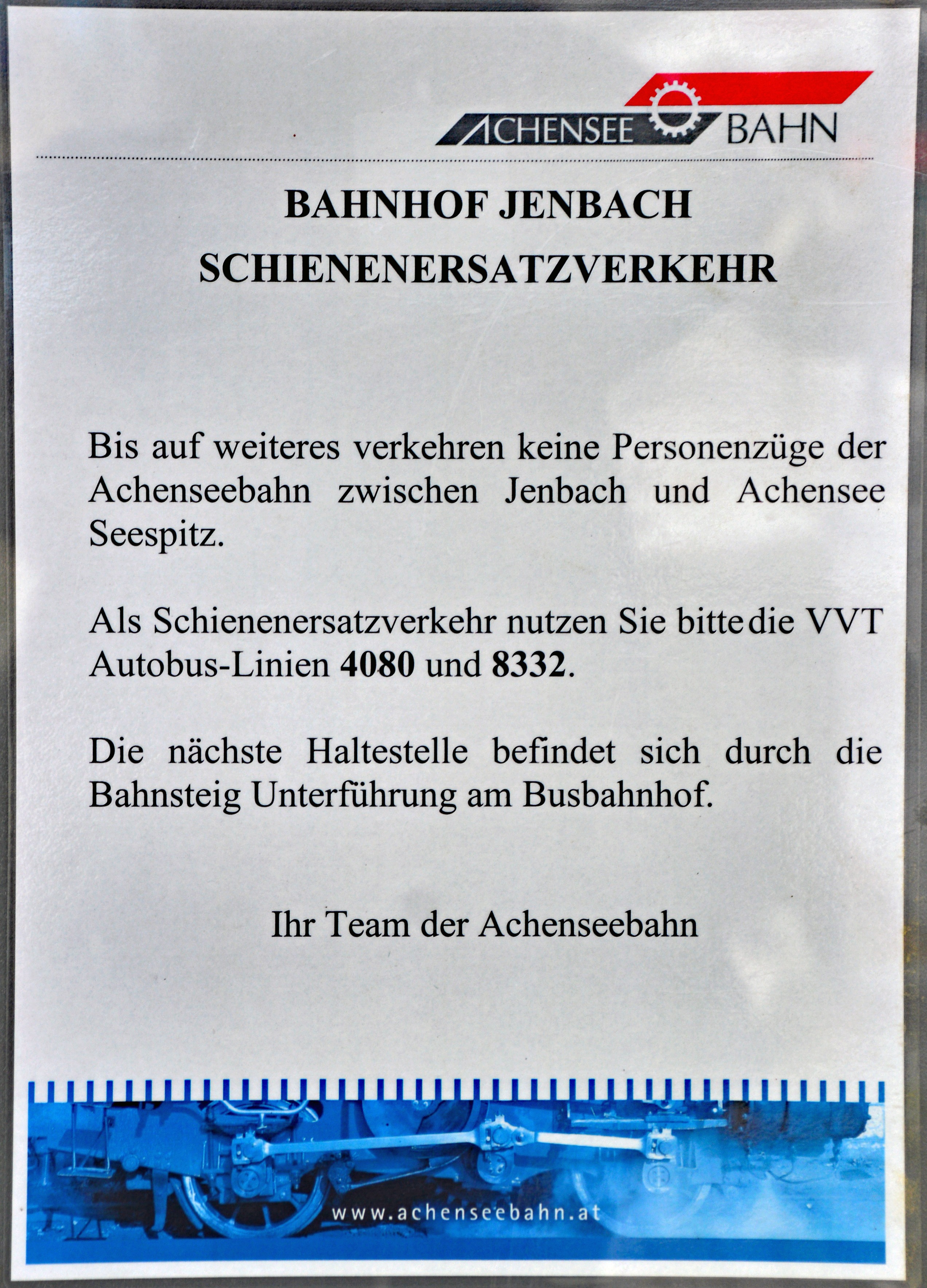 Achenseebahn Bahnhof Jenbach, Hinweis auf einen Schienen-Ersatzverkehr, der auf der anderen Seite...