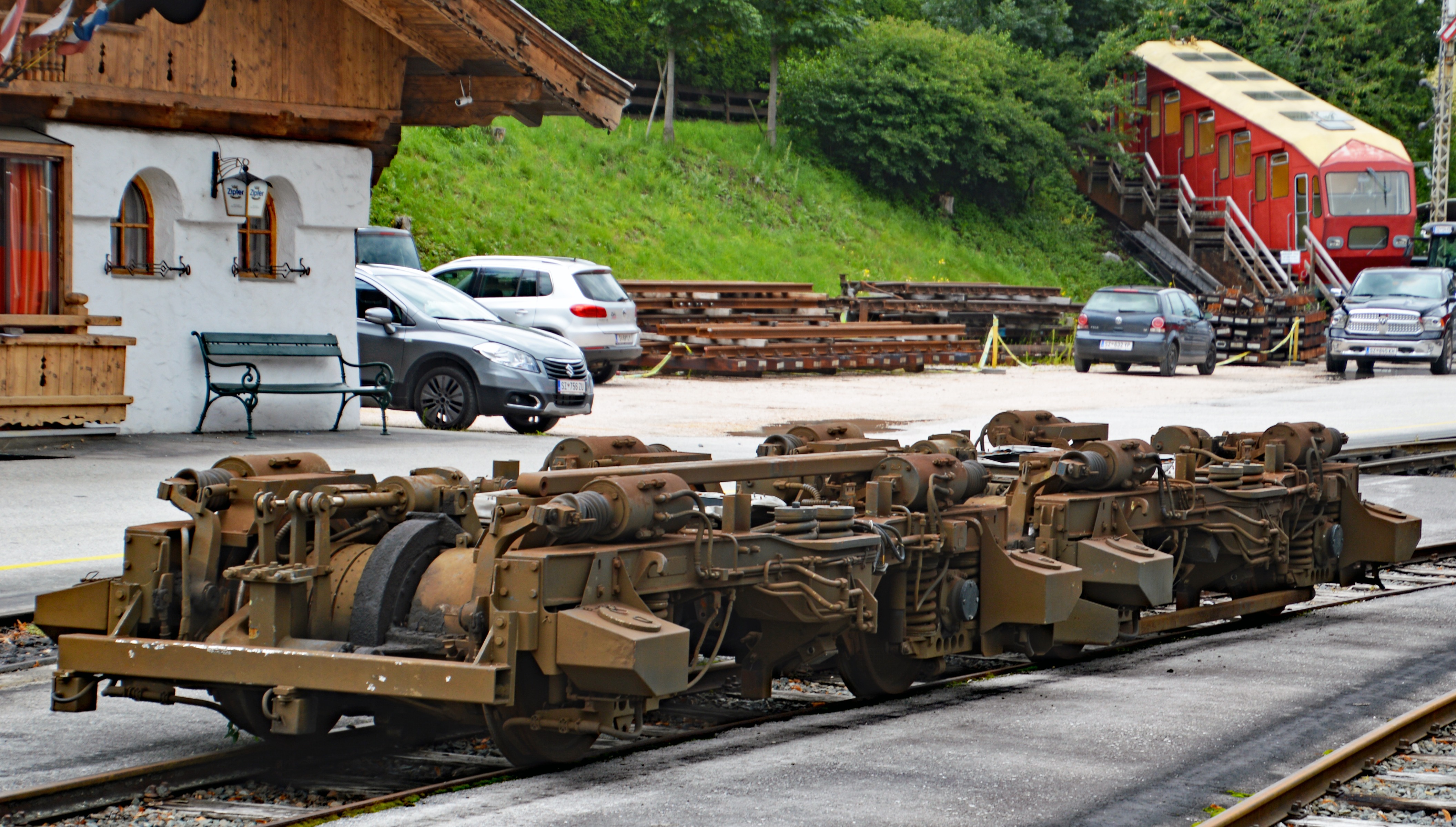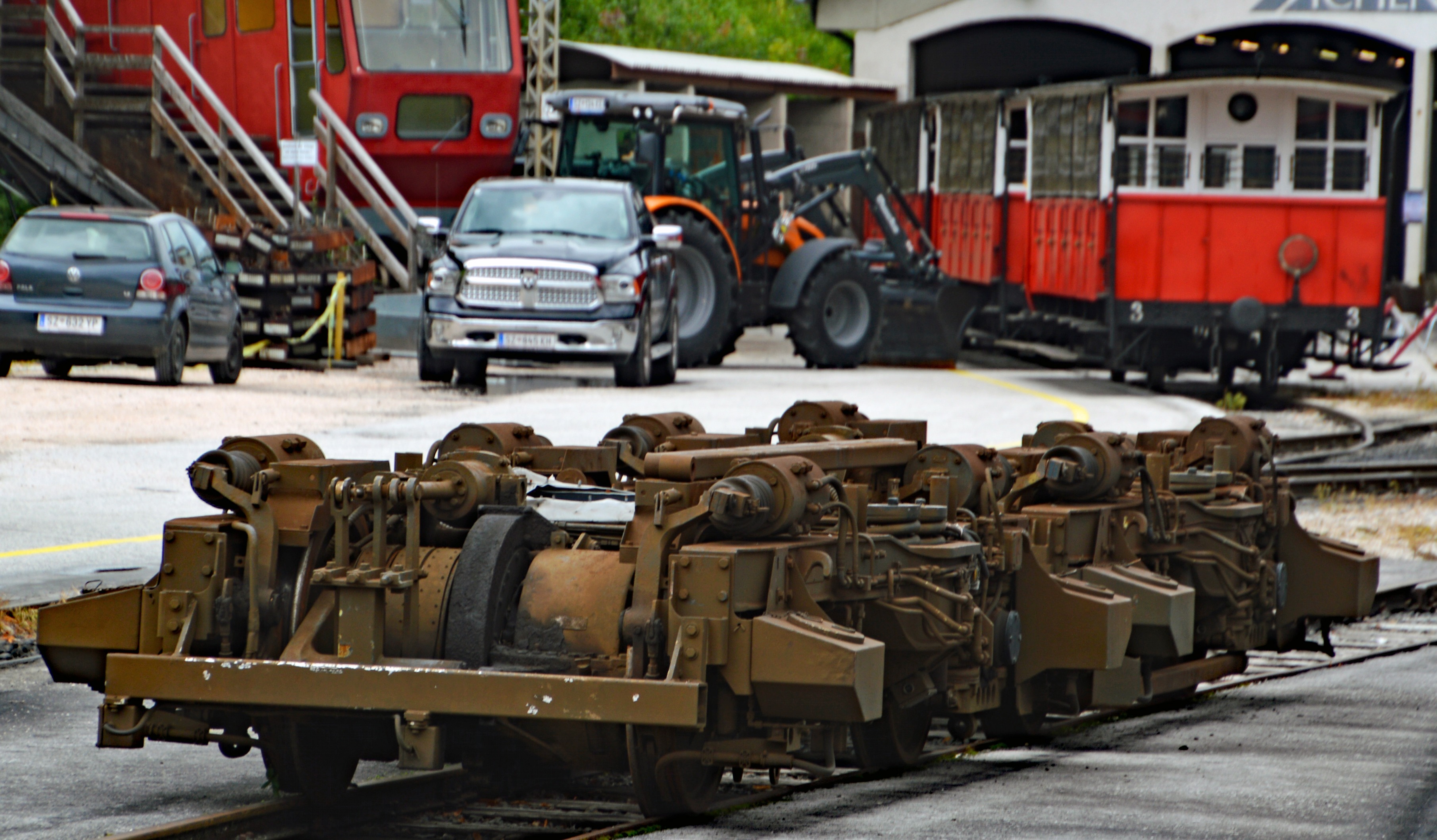 Achenseebahn Bahnhof Jenbach. Da in der Remisenhalle kein Platz für die Zukunft ist, müssen die von der Appenzellerbahn gekauften Ersatzteile, wie hier die Ersatzdrehgestelle, wie die Triebwagen selbst, im Freien aufgestellt werden.