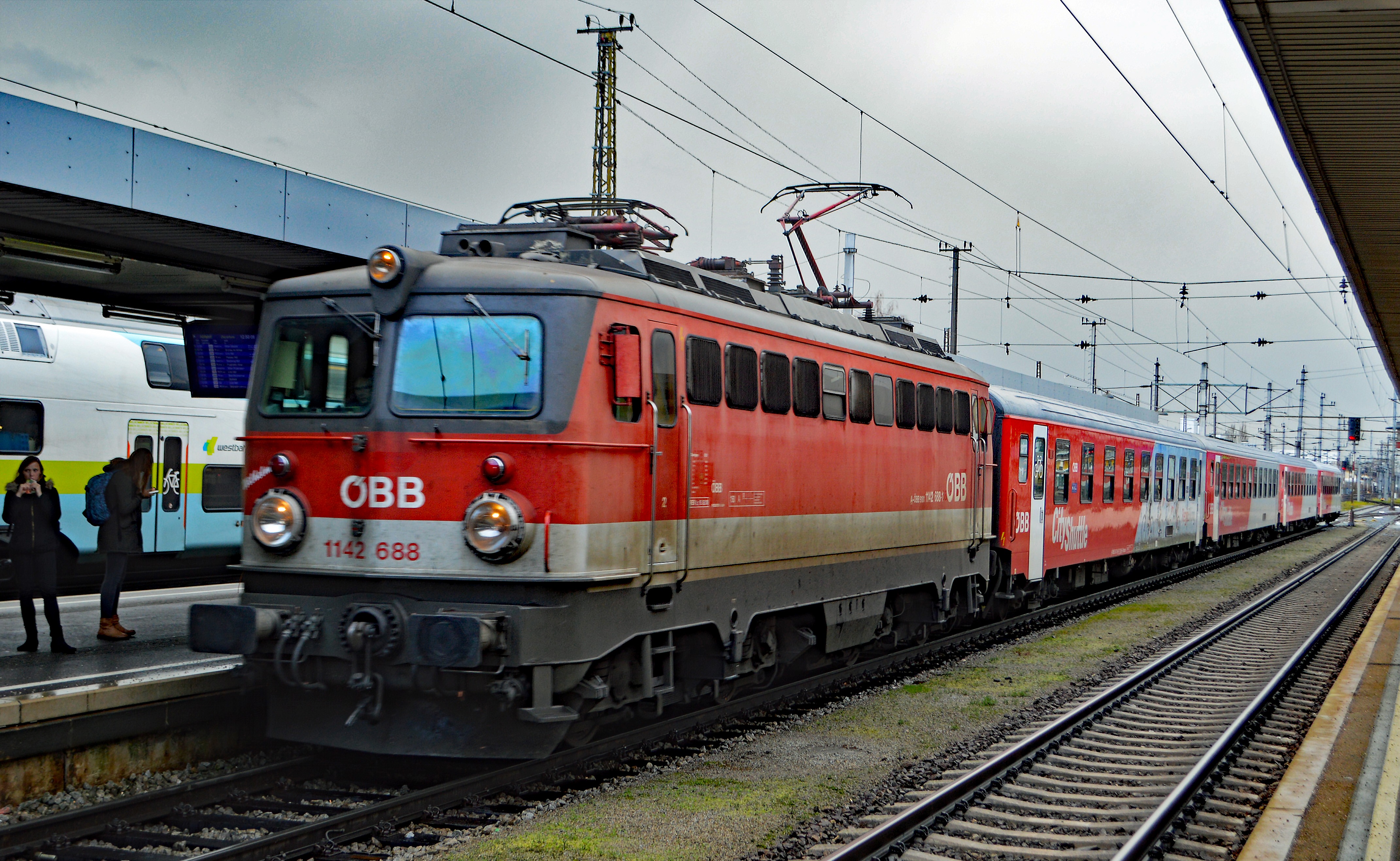"Das Naheliegende ist oftmals so fern ..." sagt ein Sprichwort. ÖBB-Ellok 1142.688 im Bahnhof St....