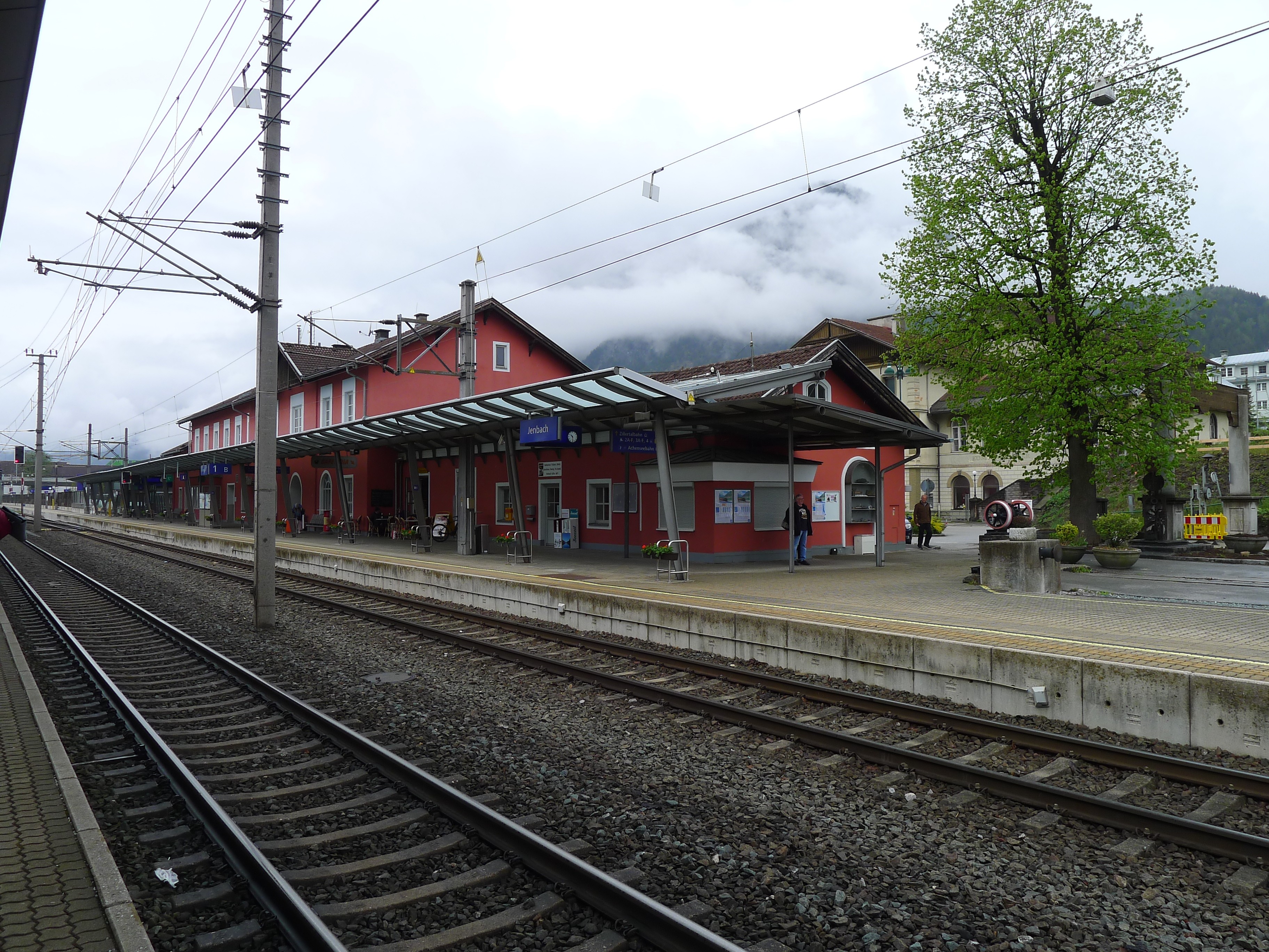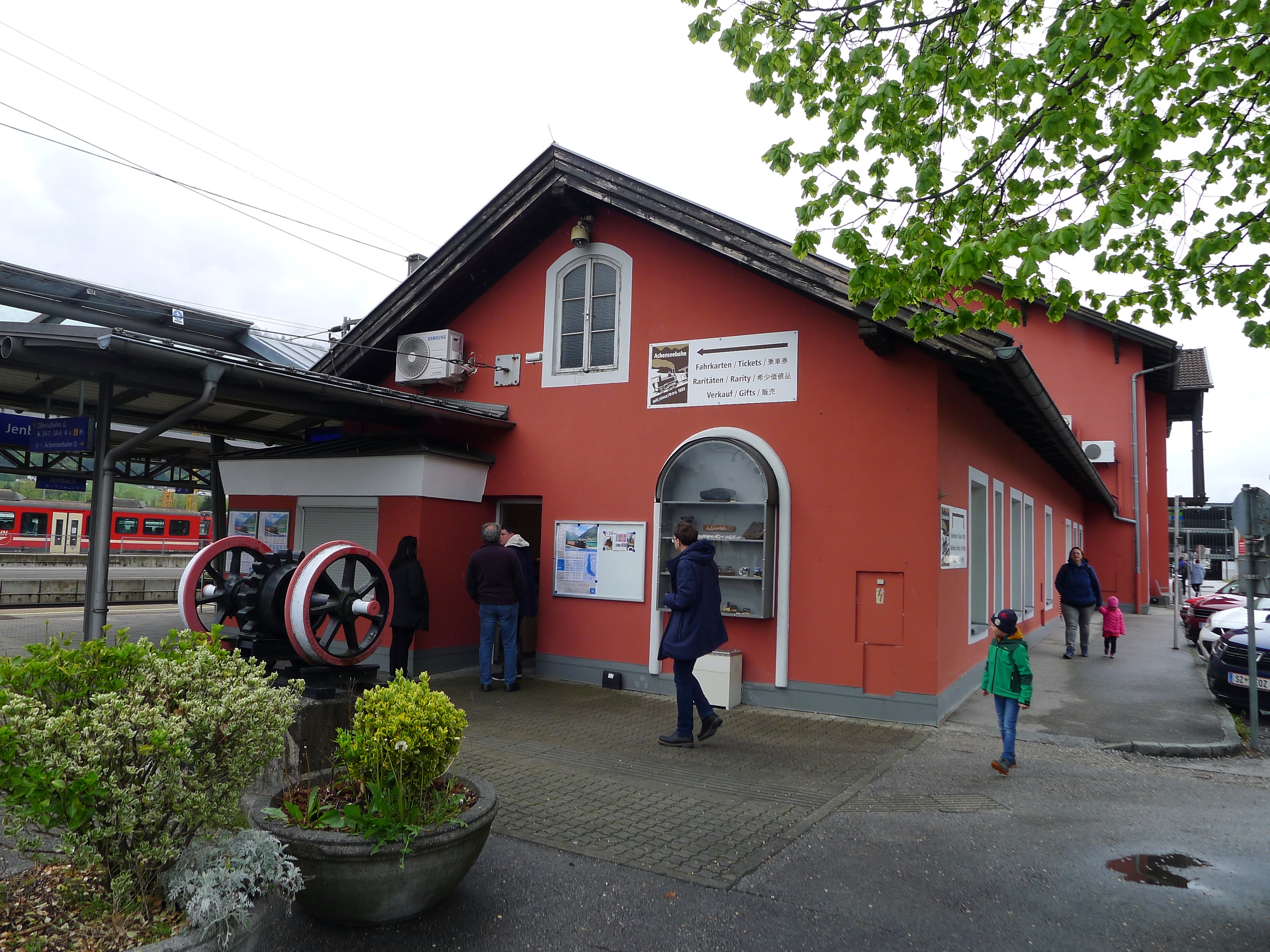 Das Bahnhofsgebäude in Jenbach mit Ticketschalter der Achenseebahn.
