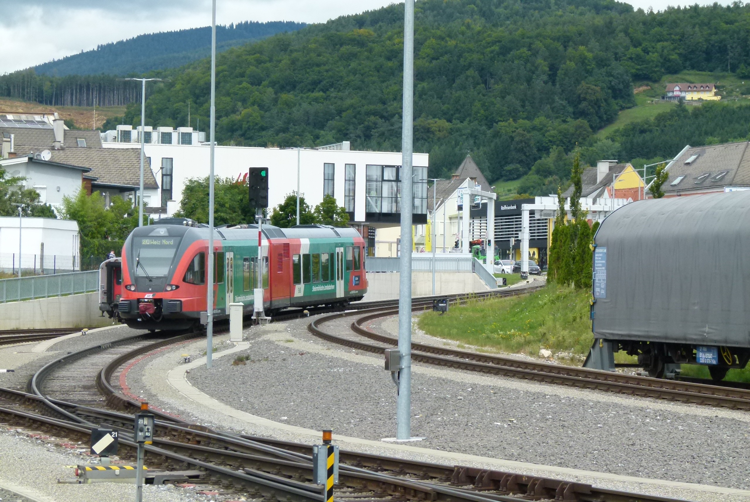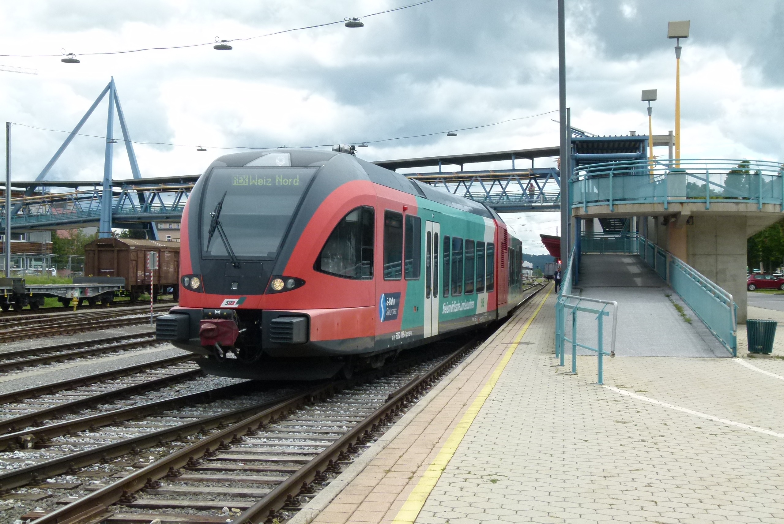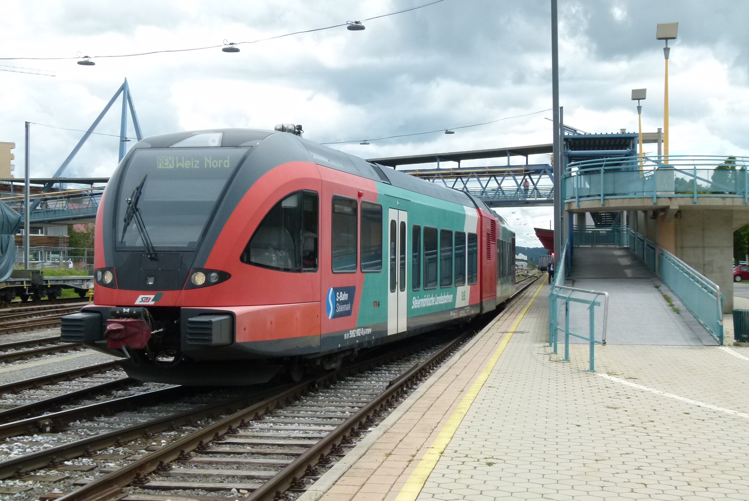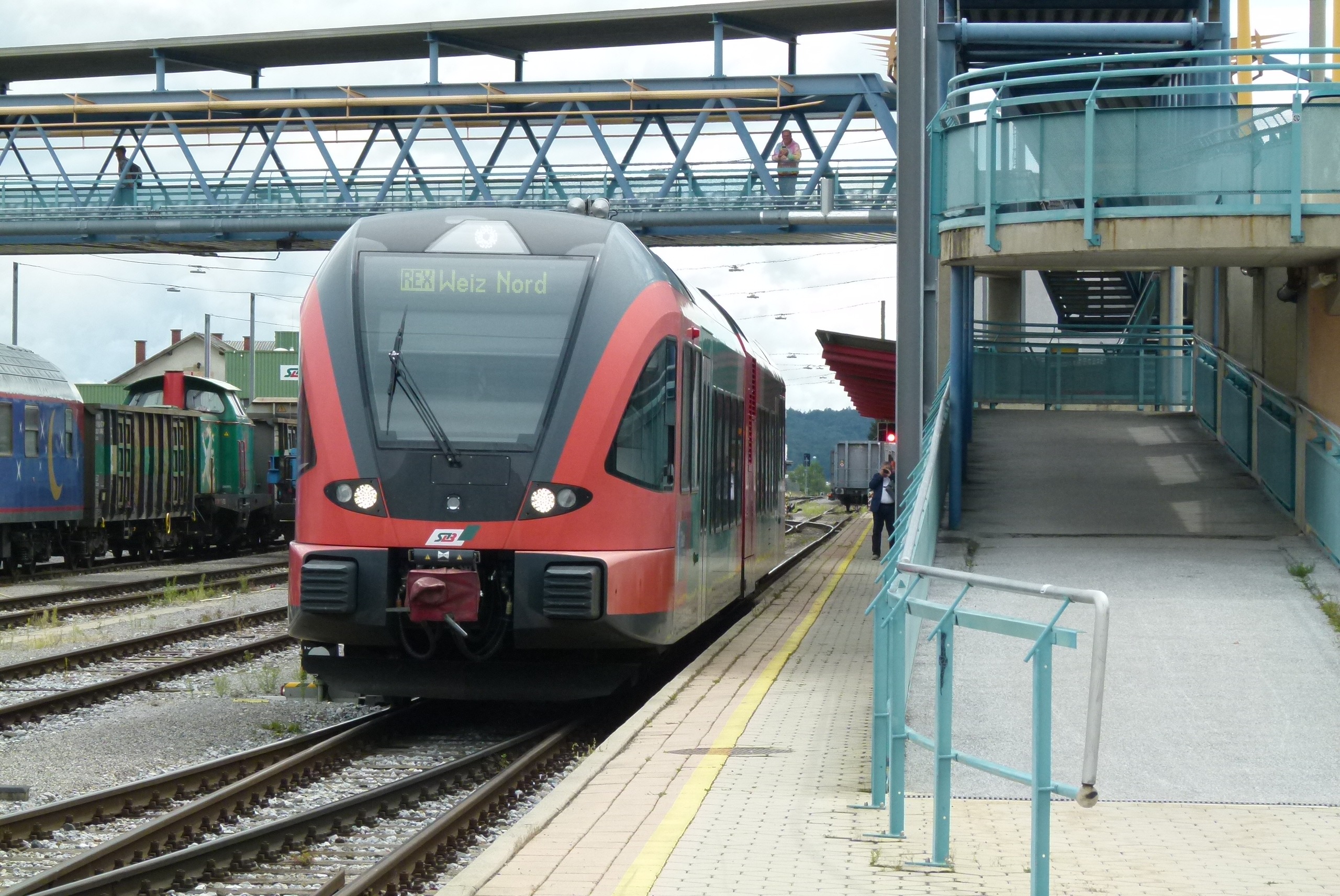 Stadler GTW 2/6 fährt in Weizer Bahnhof ein.