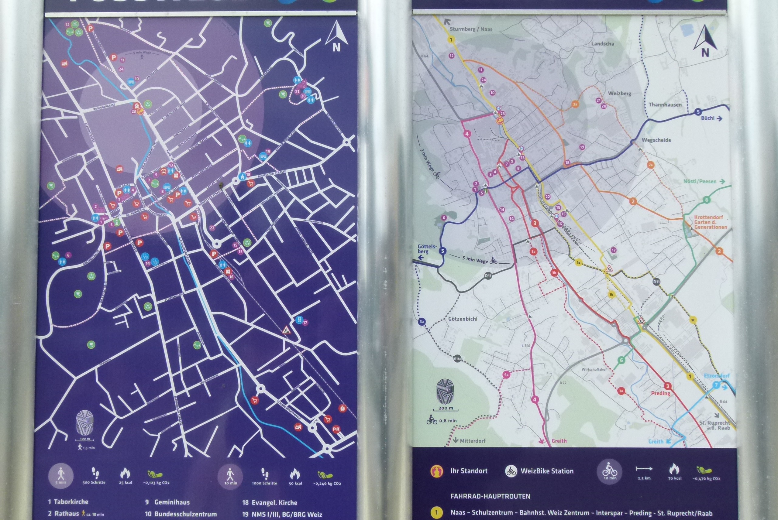 Diese Pläne zeigen alle Fuß und Radwege in Weiz mit Sehenswürdigkeiten und Freizeitanlagen.