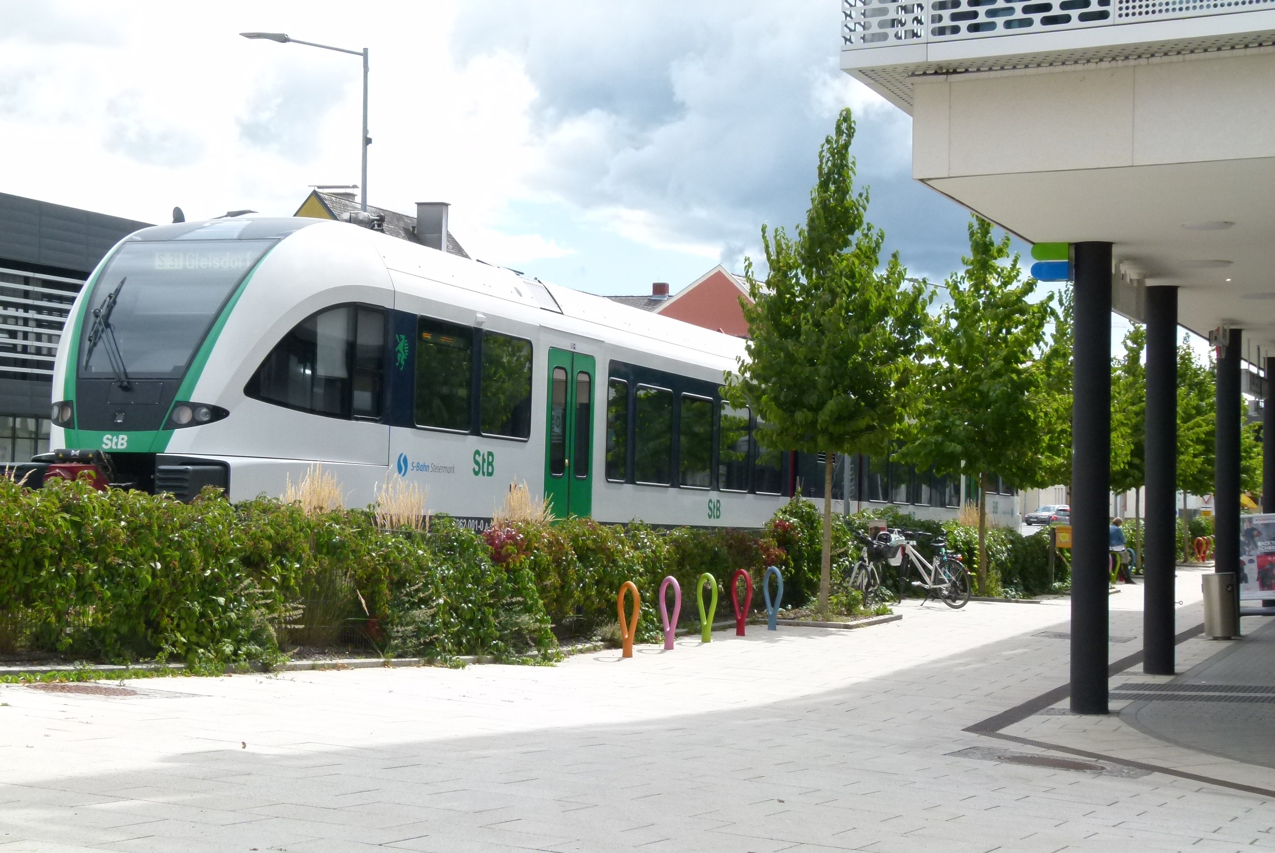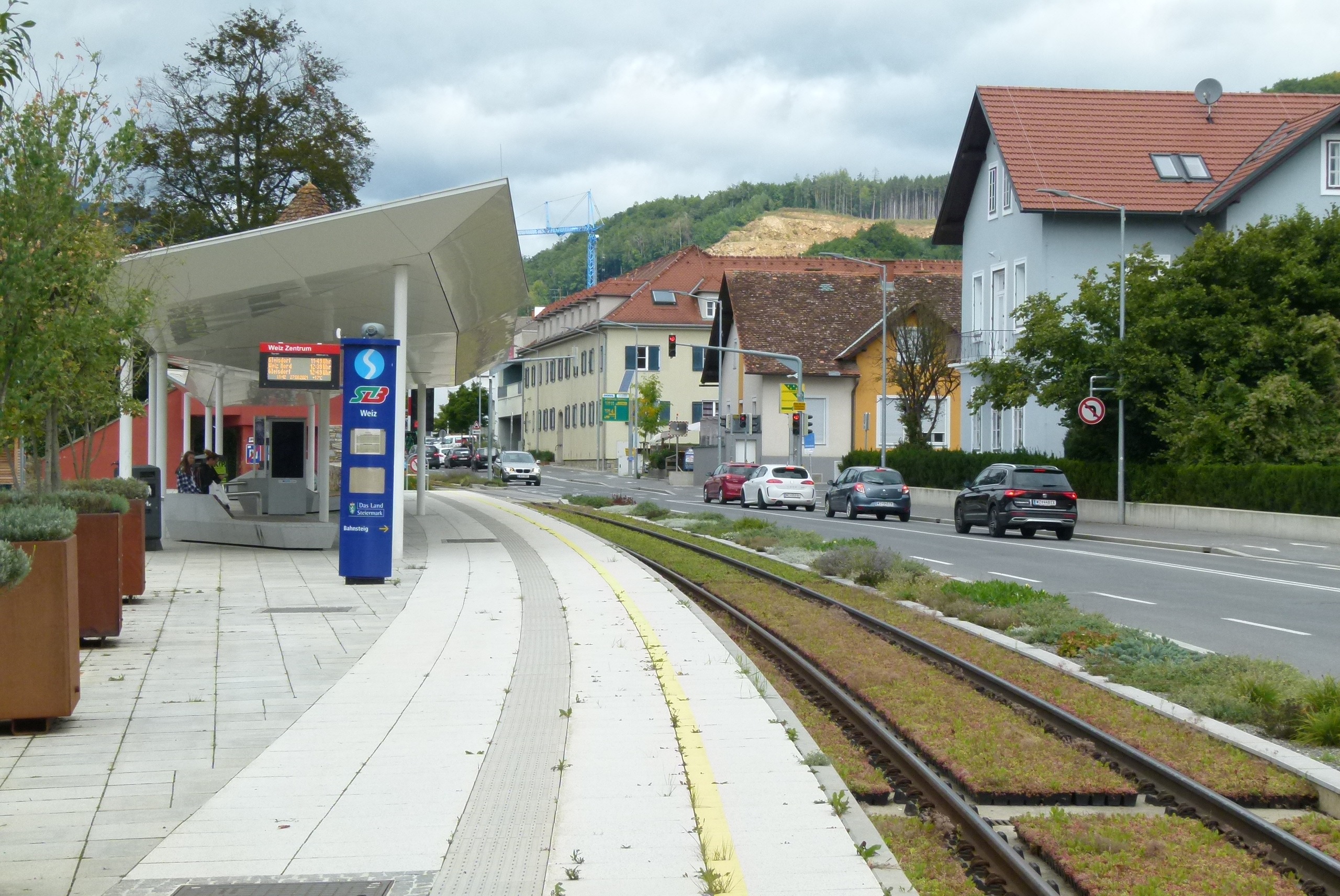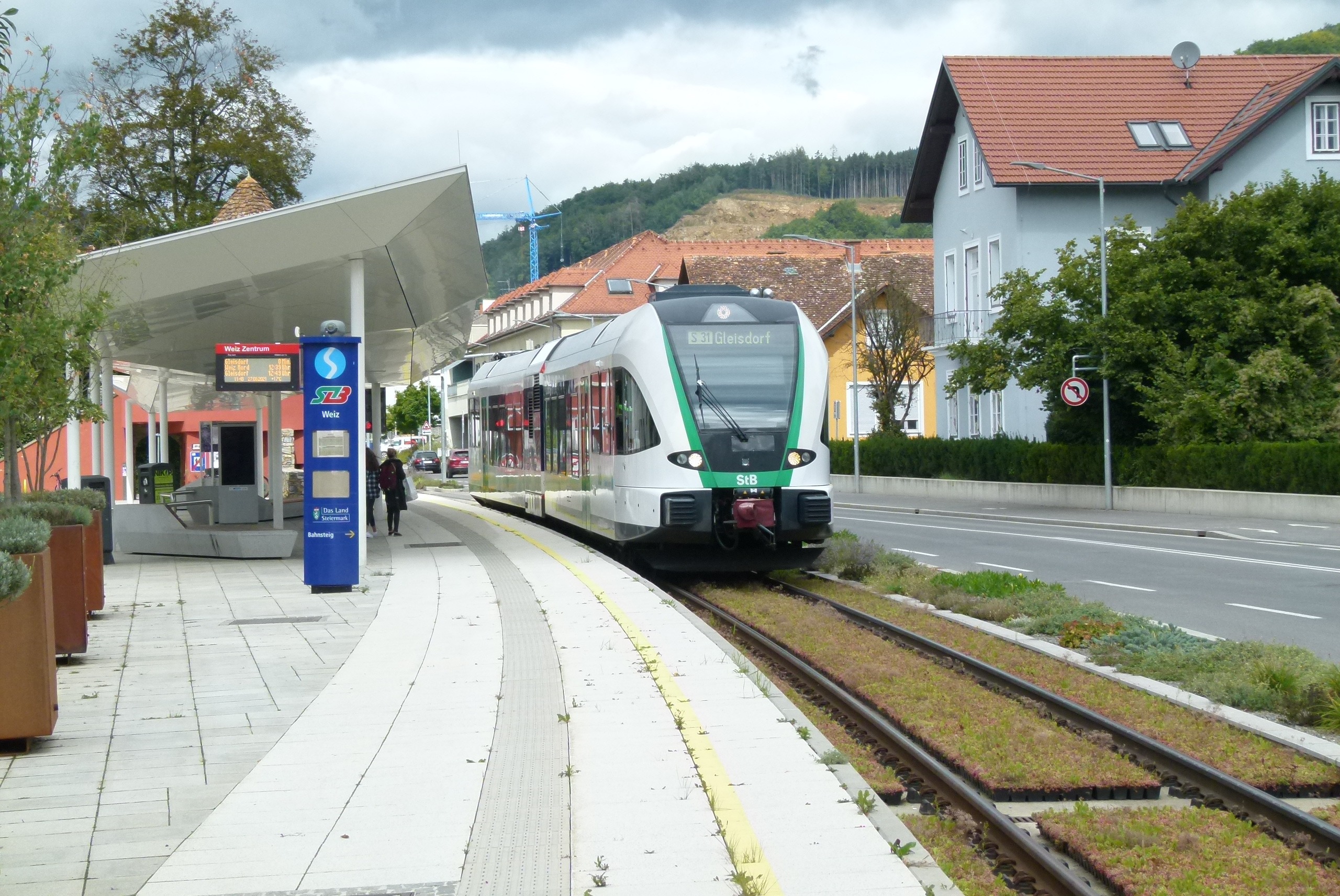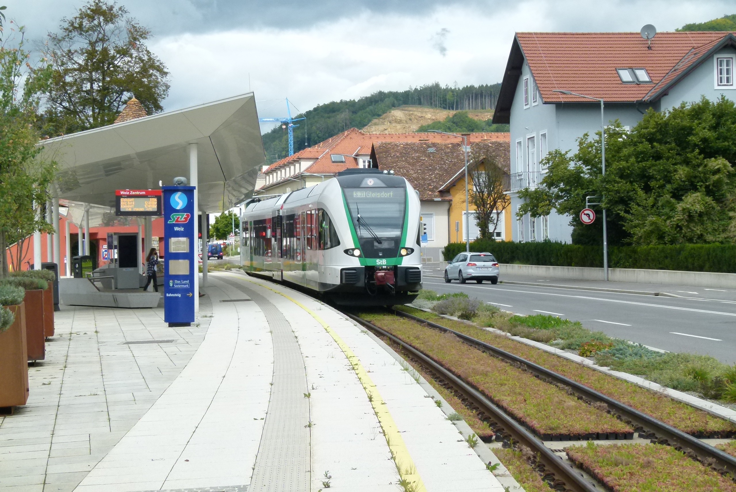Haltestelle Weiz Zentrum mit Dieseltriebwagen Stadler GTW 2/6