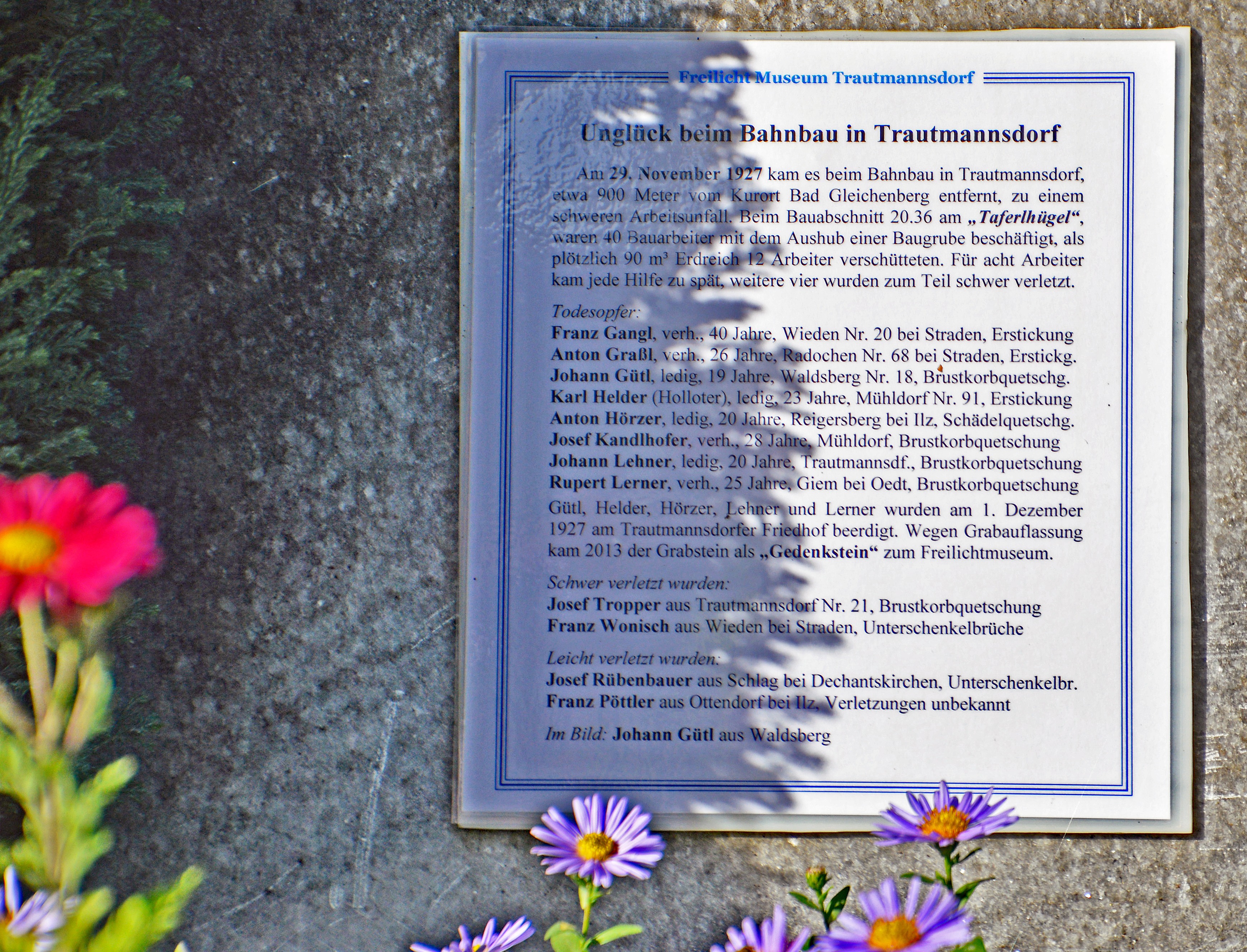 Namensliste der verunglückten Bauarbeiter beim Bahnbau der Gleichenberger Bahn 1927