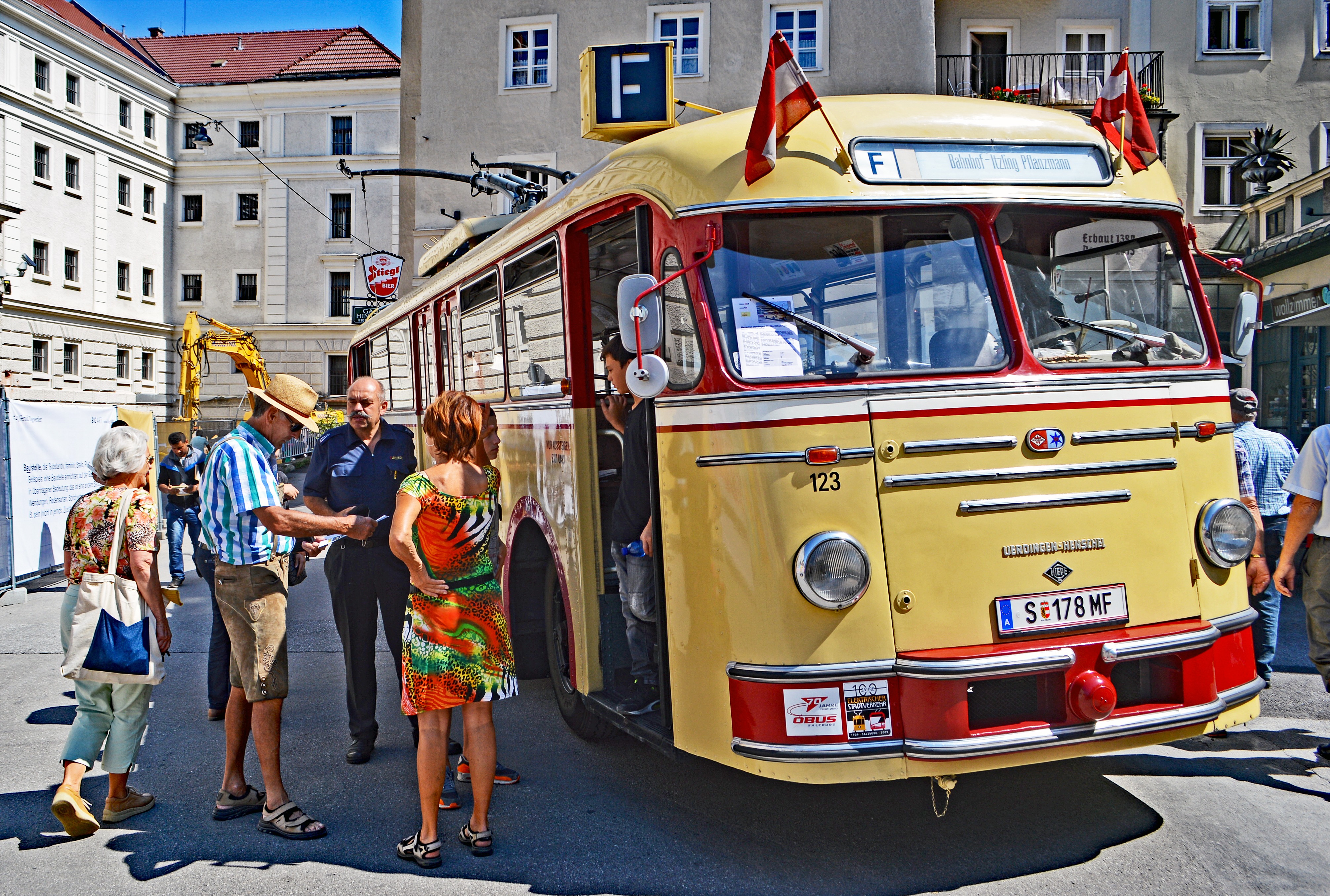 Obus 123 Verein Pro Obus (Eigentümer Jonathan Ward) bei einer Fahrzeugschau am Kapitelplatz 08/2015. Anlaß war eine Modelleisenbahn-Ausstellung des MEV-Salzburg im Café Holztrattner, in der Obus-Modelle gezeigt wurden.