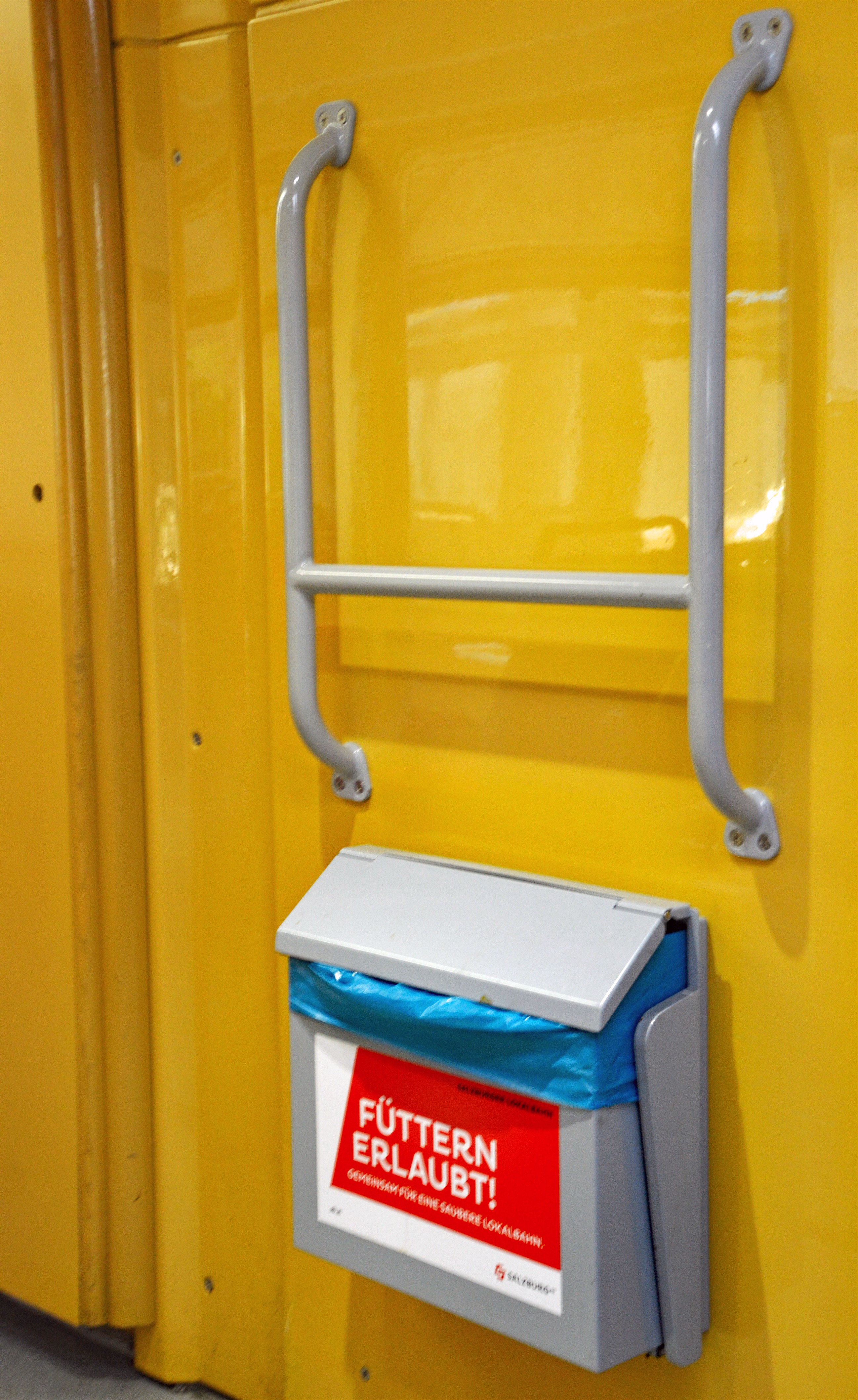 Details am Rande der Lokalbahn, "Notbremse, Abfallbehälter, Absperrpfosten aus recycleten...