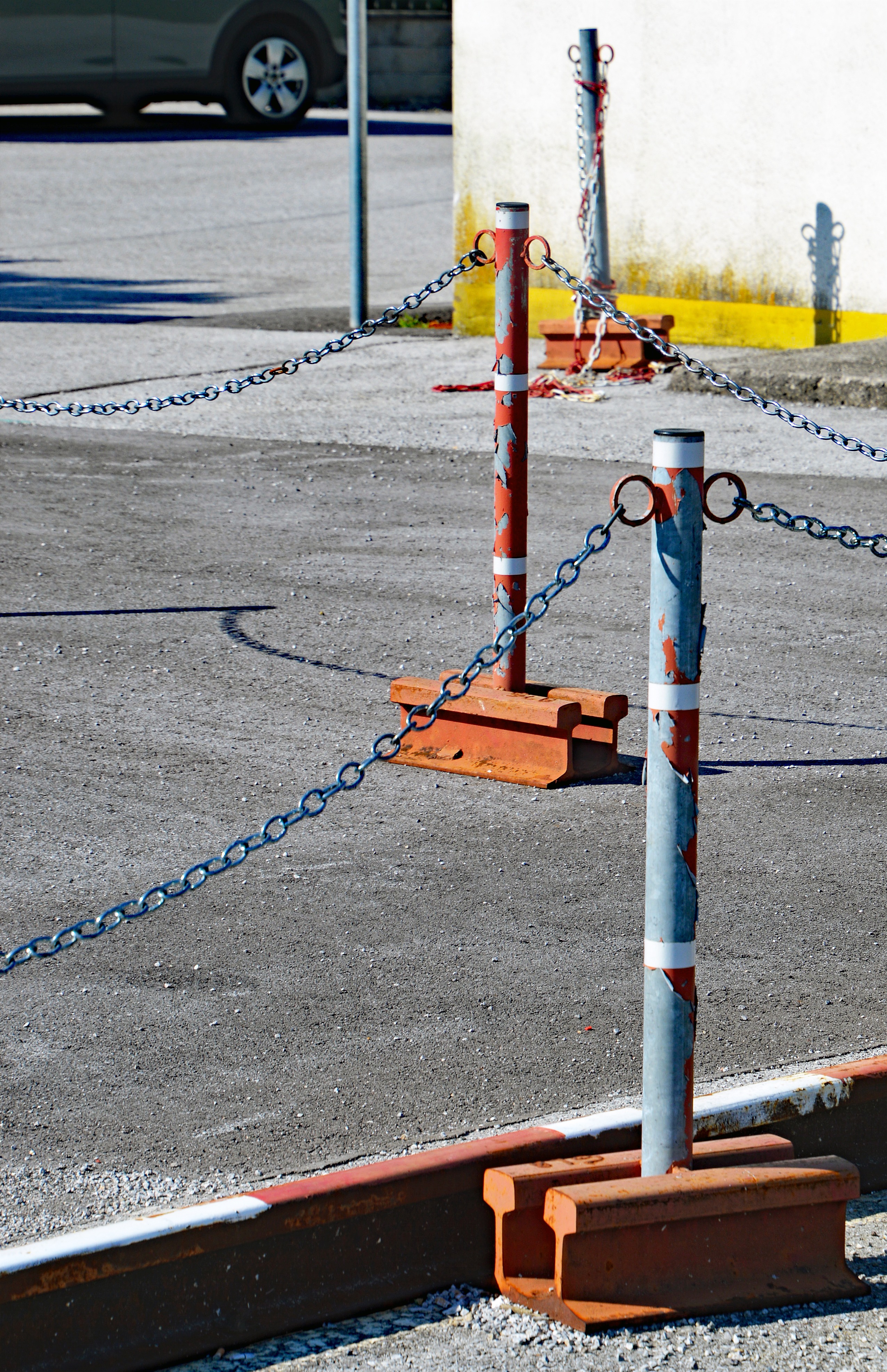 Details am Rande der Lokalbahn, "Notbremse, Abfallbehälter, Absperrpfosten aus recycleten Schienenprofilen
