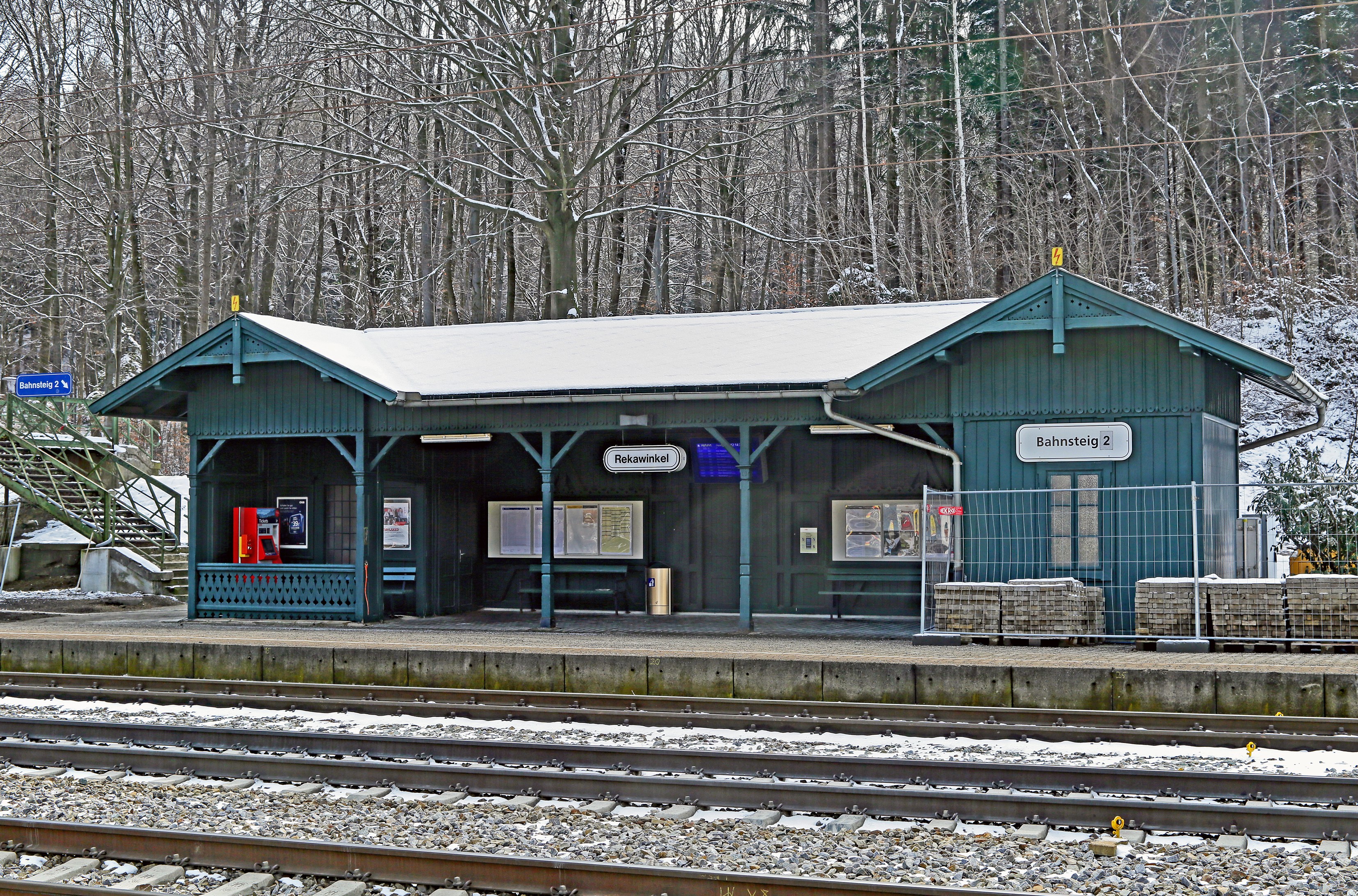 Bahnhof Rekawinkel an der Westbahn steht unter Denkmalschutz und wurde 2017 barrierefrei mit Lift umgebaut. Leider wurde auf das WC vergessen. Das Bahnhofsrestaurant dahinter wurde entfernt und damit die Chance eines Ensembleschutzes vertan